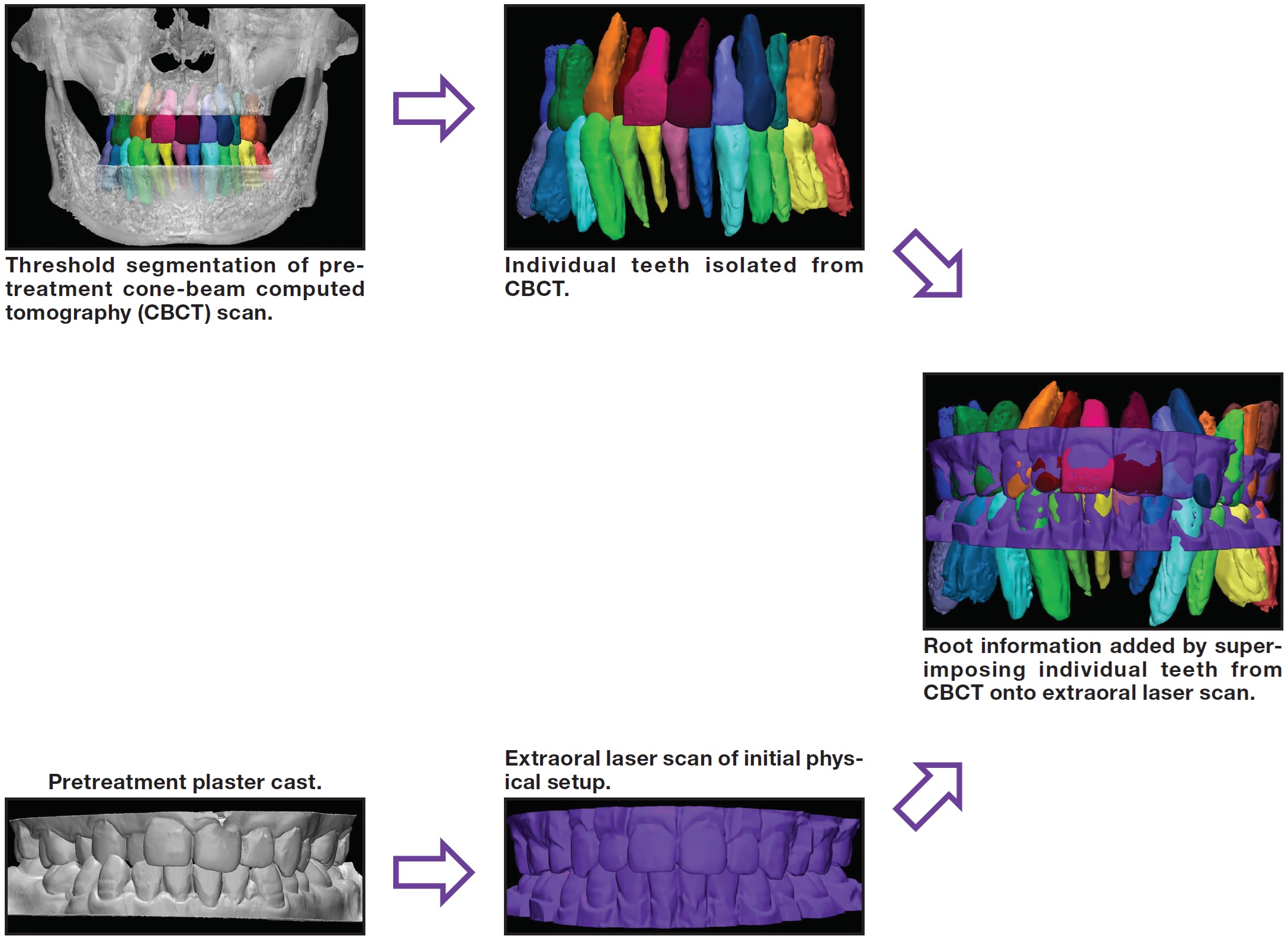 Although our demonstration involved an extraoral laser scan of a physical setup, we believe the procedure will work even better on virtual setups because the evaluation, modification, and confirmation of root position can be accomplished instantaneously, without the need for additional extraoral scans. One disadvantage is that a substantial amount of time and effort is required for the threshold segmentation of each tooth from the complex craniofacial bony structures and for the superimposition of individual crowns. Further advances in imaging technology and processing software may make this process much faster and easier to perform.