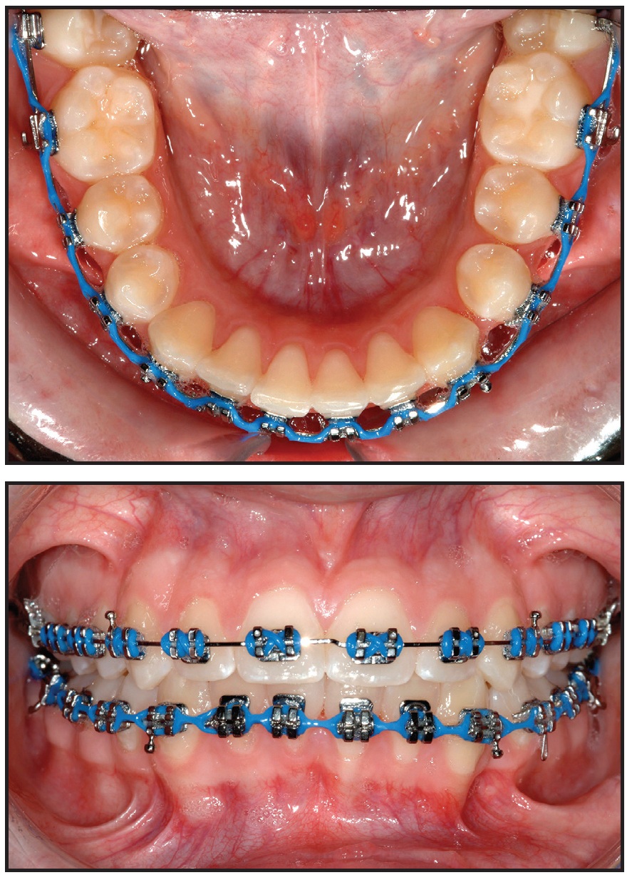 Ten weeks later, the maxillary archwire was changed to .016" × .022" nickel titanium and the mandibular archwire to .016" nickel titanium. Another seven weeks later, the mandibular archwire was increased to .016" × .016" nickel titanium.