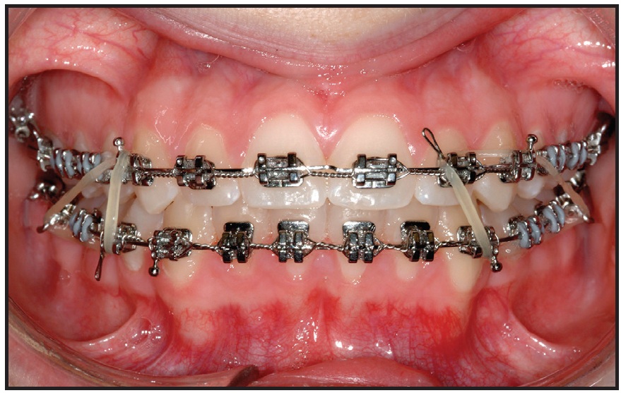 Fig. 5 Case 1. After 12 weeks of treatment, placement of .016" × .016" nickel titanium maxillary archwire and .016" nickel titanium mandibular archwire.