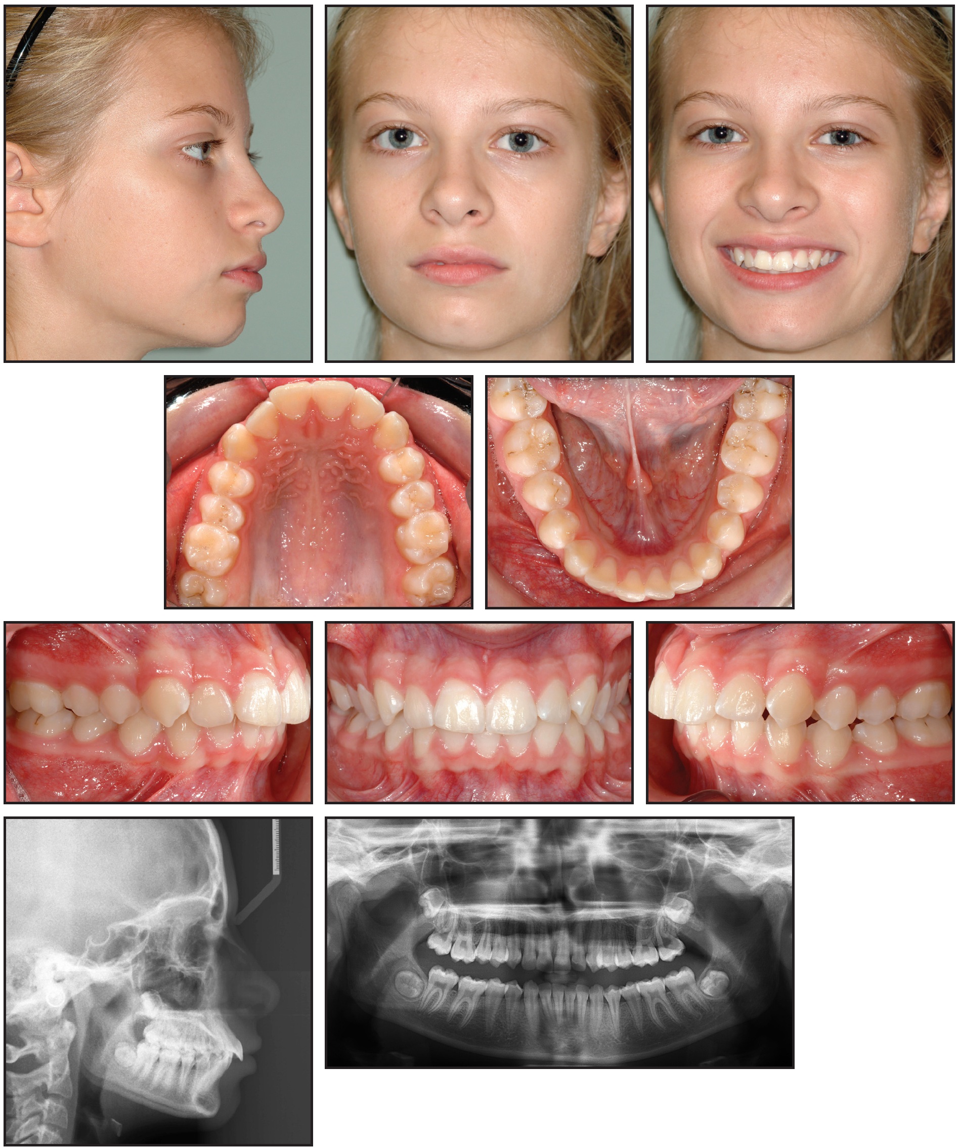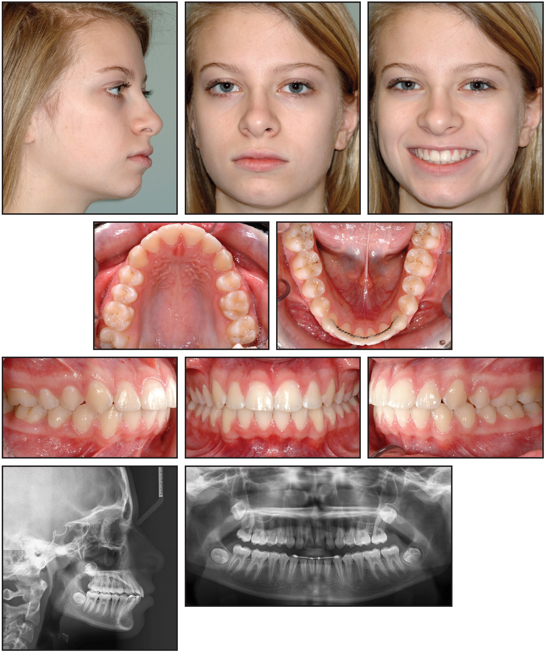 A mild malalignment of the anterior teeth was accompanied by rotation of the upper and lower right second premolars. All four third molars were immature and present on the panoramic x-ray. Cephalometric analysis confirmed a mild skeletal Class II relationship and a normal vertical dimension. Frontal and profile facial esthetics were pleasing, and there were no periodontal concerns.