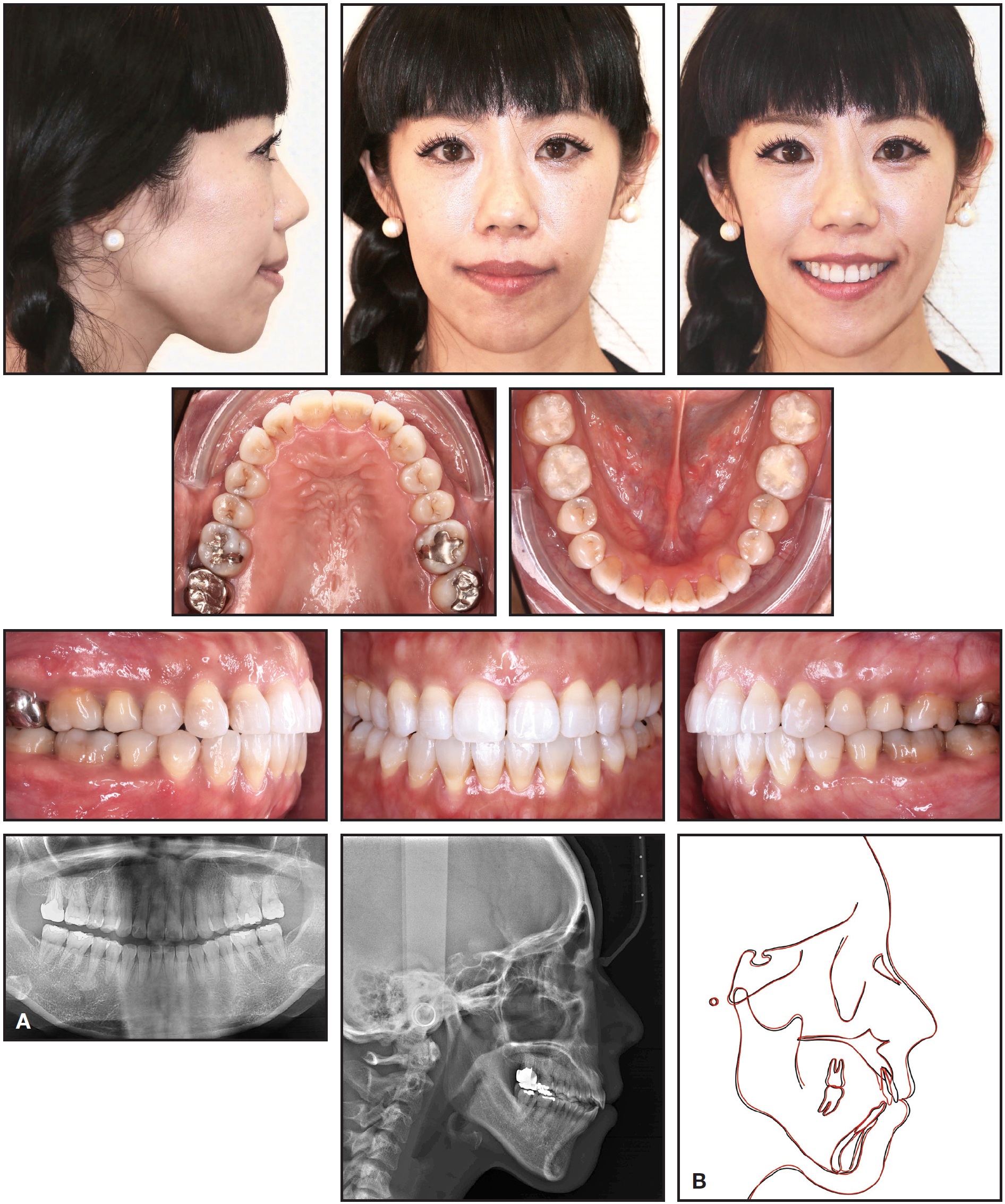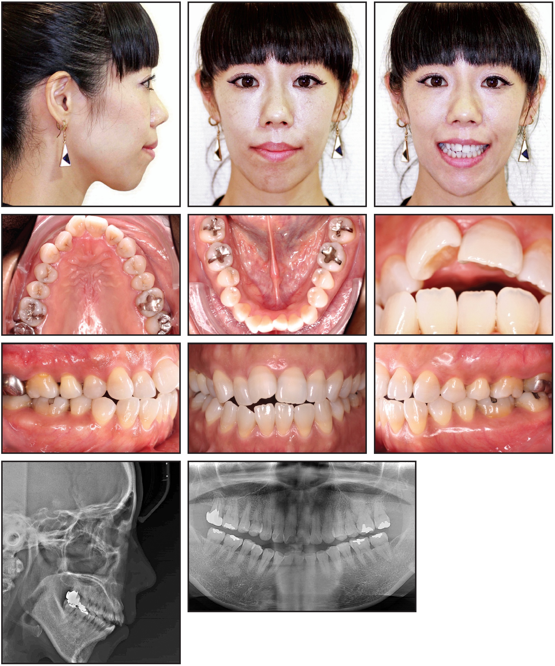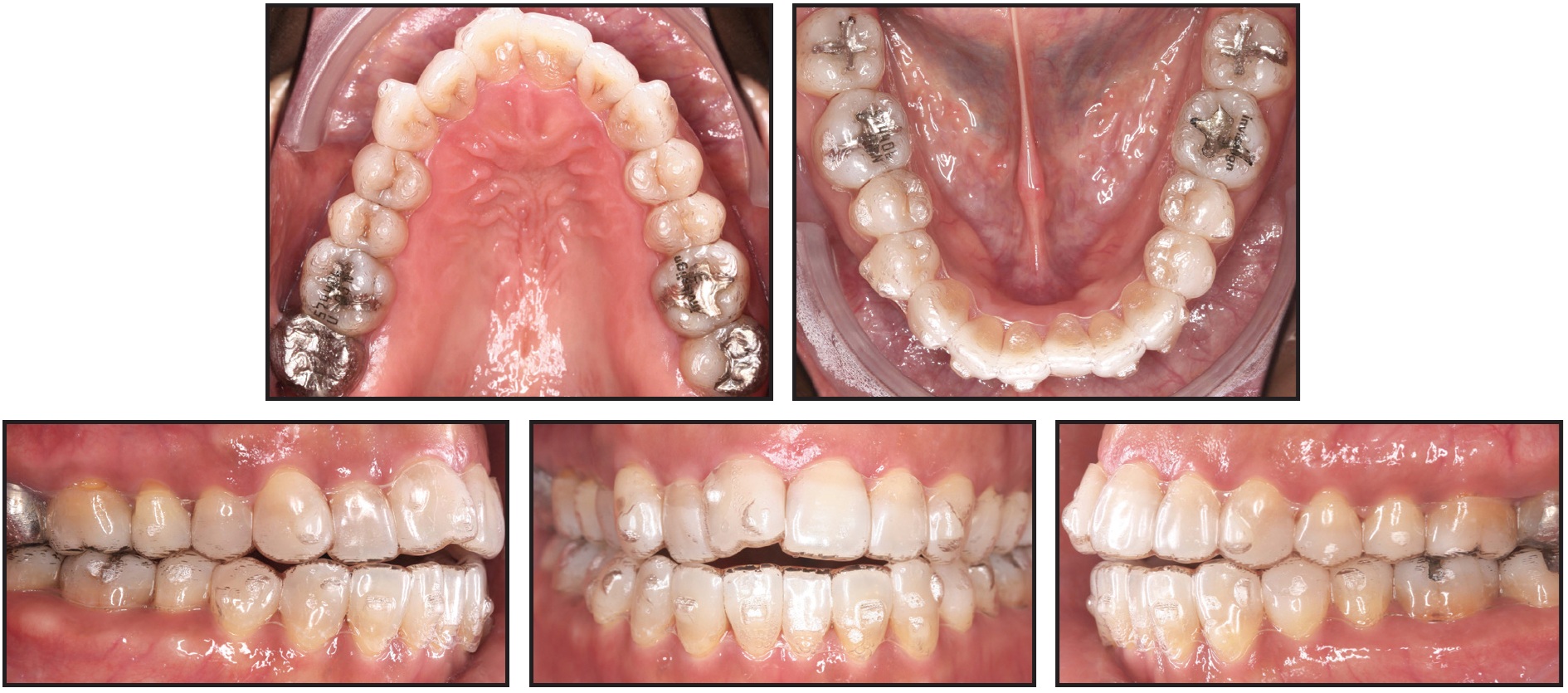 A 40-year-old female presented with an anterior open bite, a crossbite of the upper right lateral incisor, upper and lower anterior crowding, a V-shaped maxillary arch, a Class I malocclusion, and lip tension on closure (Fig. 1).