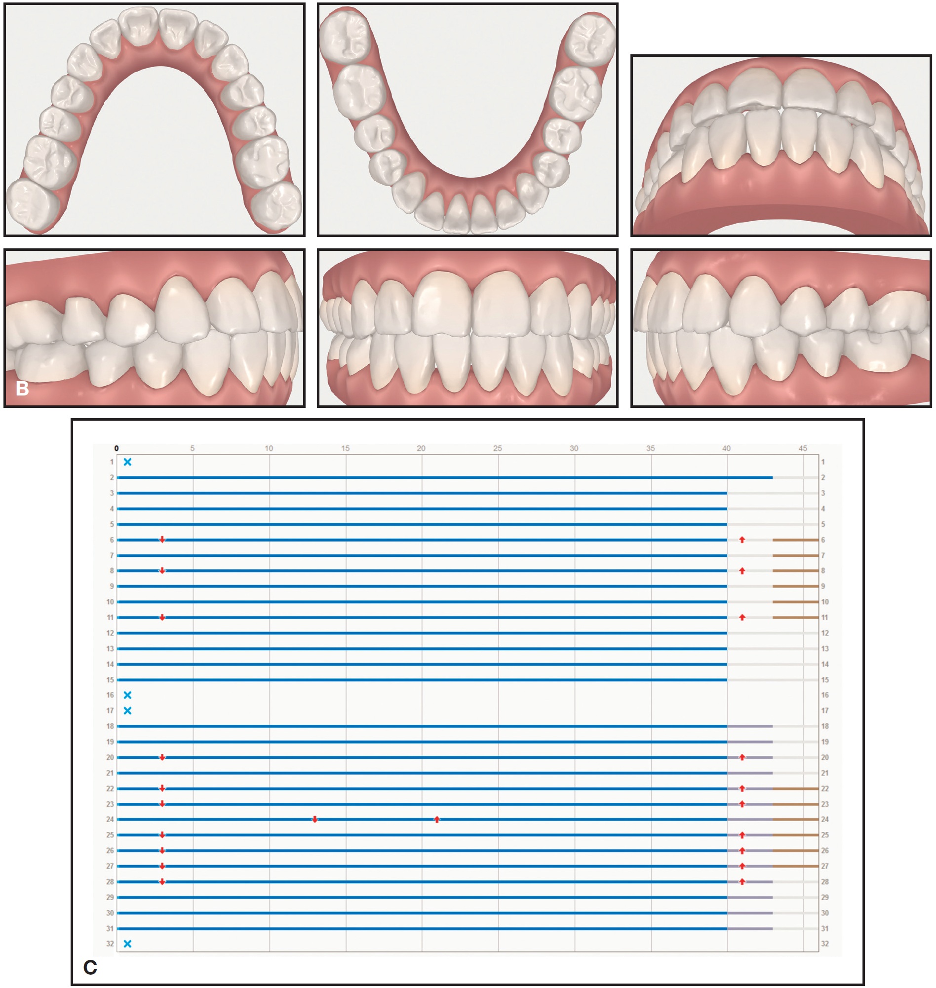 Fig. 2 (cont.) ClinCheck records. B. Projected post-treatment. C. Staging showing simultaneous movement of upper and lower arches with 46 sets of aligners over 21 months of treatment.