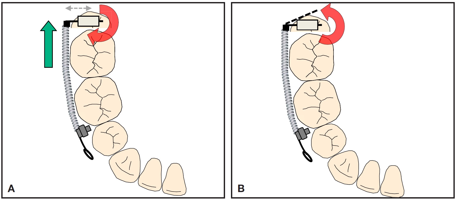 Fig. 2 A. Buccal eccentric force applied by uprighting mechanics generates clockwise moment on third molar, causing distal rotation. B. To counteract this effect, wire is bent distally before insertion into molar tube, generating counterclockwise moment.