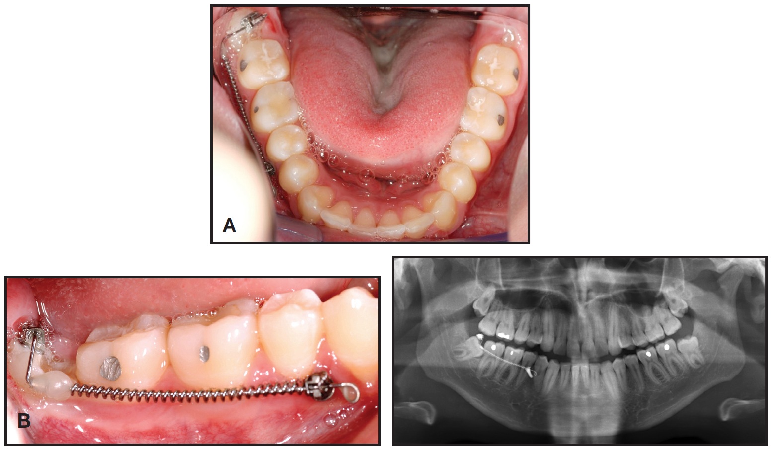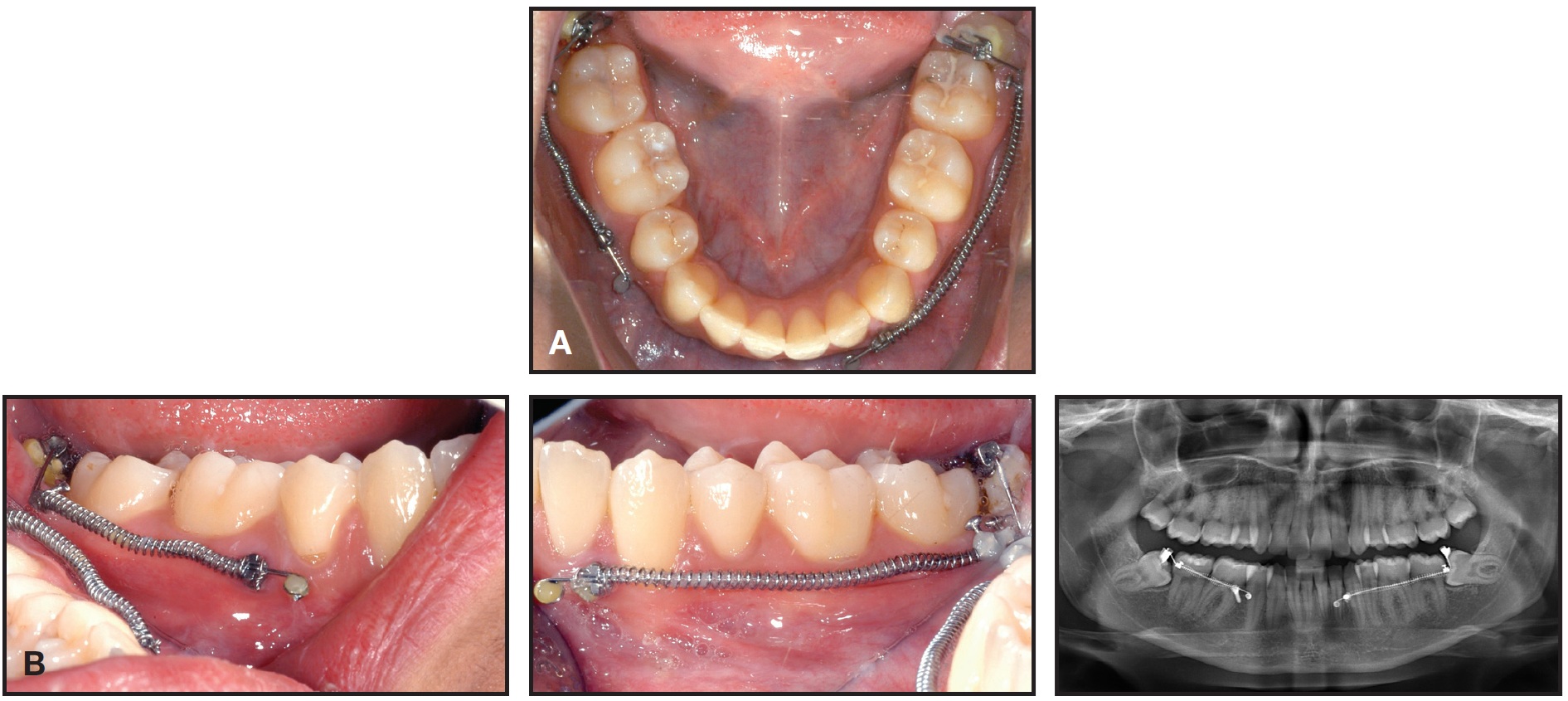 The approach shown here loads the mini-implant with a lateral force. Previously described force systems achieve molar uprighting by generating an axial moment on the mini-implant,12 but axial loading is associated with higher rates of mini-implant failure.13 An axial direction of force could actually be favorable in a case with residual space mesial to the tipped molar due to loss of the adjacent molar, where a mini-implant of larger diameter could be inserted vertically into the alveolar process.14