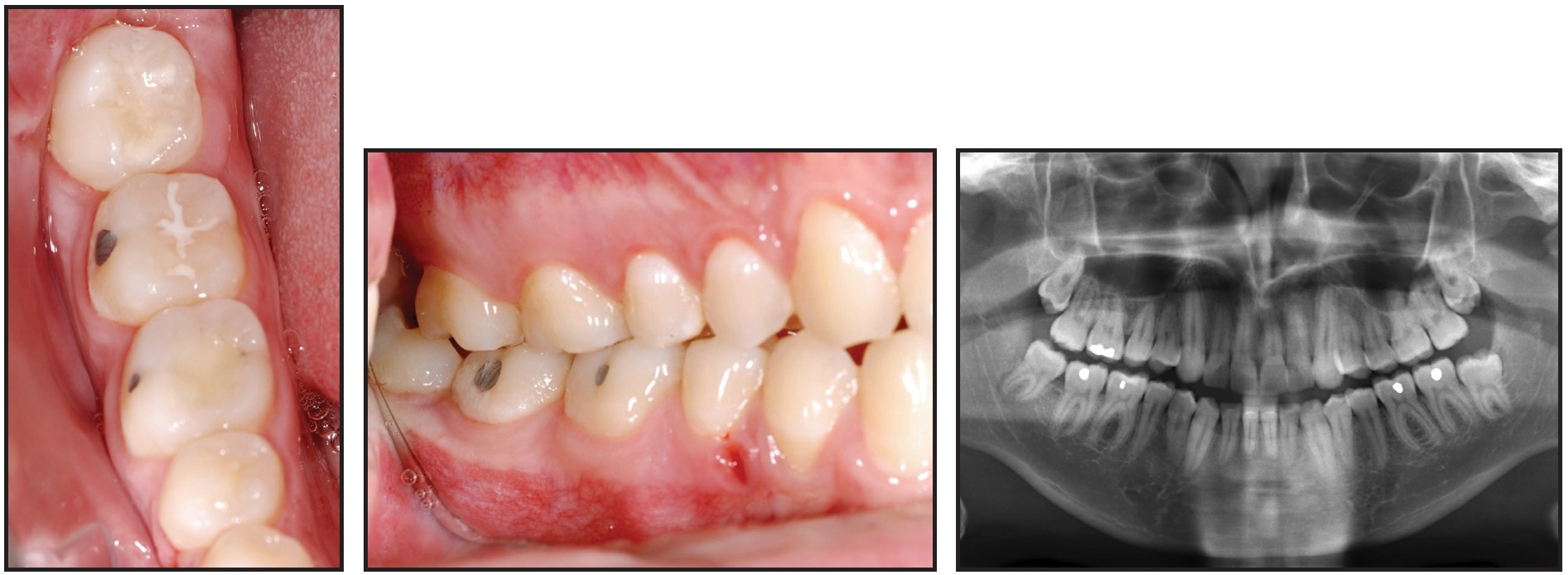 Six months later, with the third molar fully upright, the appliance was removed (Fig. 5). The lower right third molar was in stable occlusion with its antagonist, but the upper third molars had not yet erupted. Contrary to expectations, the lower left third molar remained in its original vertical position and may require active alignment.