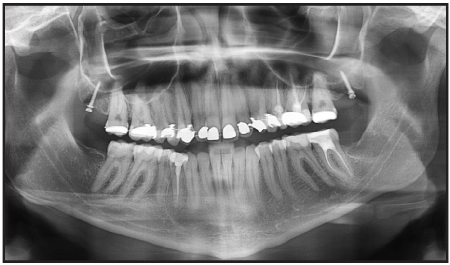 Fig. 2 Six months after extraction of upper third molars, one Dual-Top* mini-implant placed in each maxillary tuberosity.