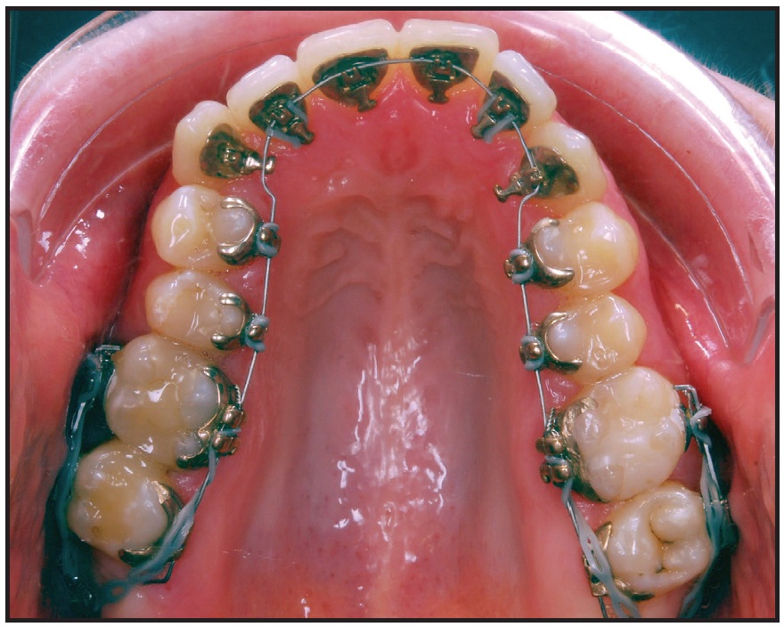 Two Dual-Top* JA standard mini-implants (1.6mm x 10mm) were placed distal to the second molars in the maxillary tuberosities (Fig. 2). One and a half months later, since the patient wanted to be treated with invisible appliances, the Incognito** lingual system was bonded and an .014" nickel titanium archwire was inserted (Fig. 3). This appliance is compatible with skeletal anchorage and has proven reliable in complex treatments. Gentle force was applied with elastic chain from the miniscrews to distalize the upper teeth. To prevent undesirable transverse movement of the molars, tubes or brackets were bonded to the buccal surfaces of the first and second molars and connected by sectional .016" x .022" nickel titanium wires.