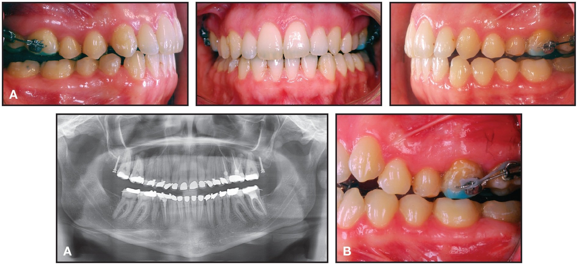 In less than a year of treatment, the anterior open bite was closed and the molar Class II malocclusion improved, but a posterior open bite had been created (Fig. 4A). Comparing the initial panoramic x-ray and a progress x-ray taken at that time, there was a considerable reduction in the distance between the upper second molars and the mini-implants, demonstrating a bodily maxillary retraction.