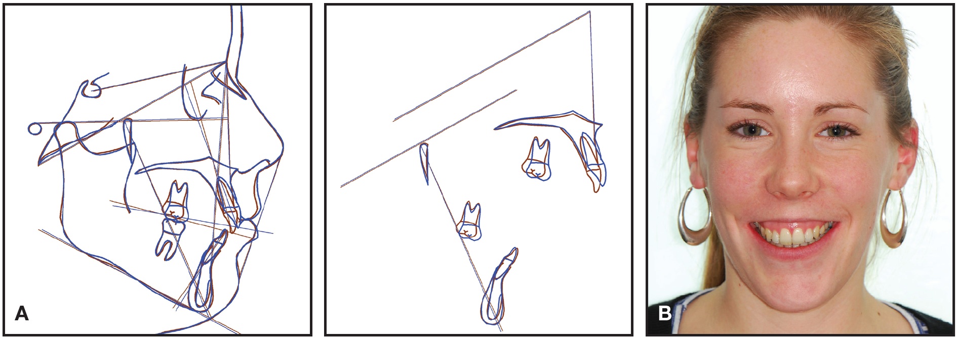 Fig. 8 A. Patient after 31 months of treatment. B. Superimposition of pre- and post-treatment cephalometric tracings.