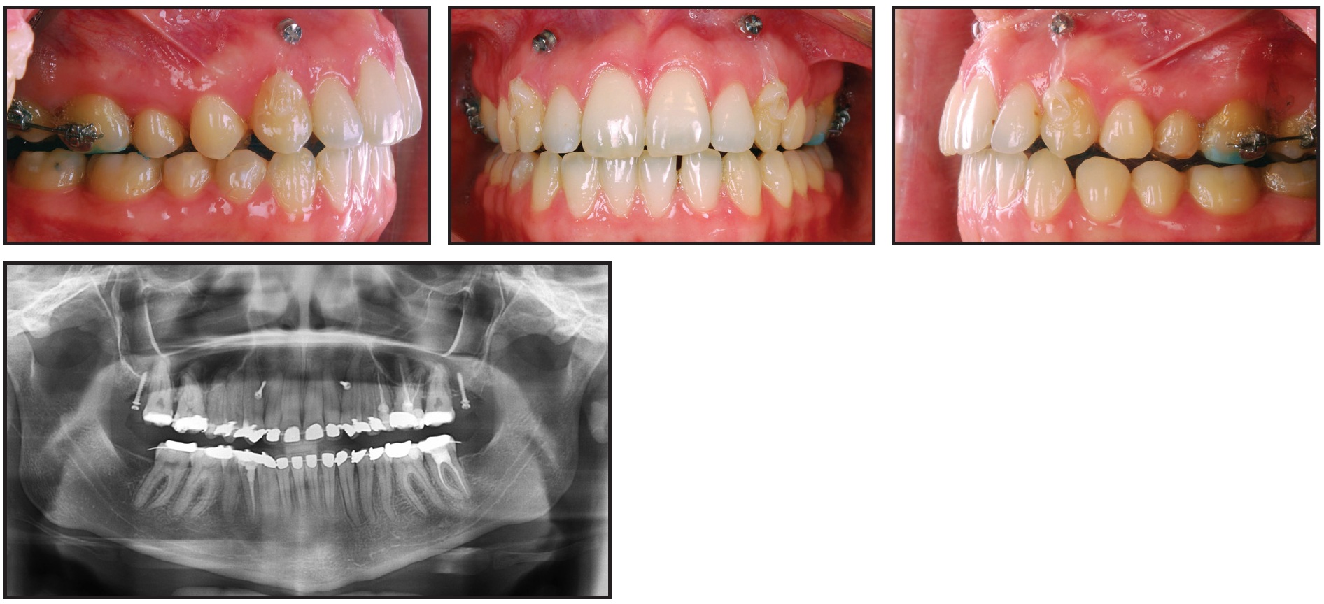 Intrusive forces applied to the upper posterior teeth generate a clockwise movement and a consequent counterclockwise mandibular rotation, so that minor changes in the upper posterior teeth can produce remarkable effects in the lower anterior region. Only 1mm of upper-molar intrusion can reportedly displace the chin up and forward by 3-4mm.19 In the case shown here, that effect was restricted by extrusion of the upper incisors. Because mandibular autorotation is limited by contact between the upper and lower anterior teeth, the upper-incisor extrusion had to be controlled with anchorage from two anterior mini-implants. On the other hand, excessive intrusion of the upper incisors should be avoided to ensure an esthetic smile line.