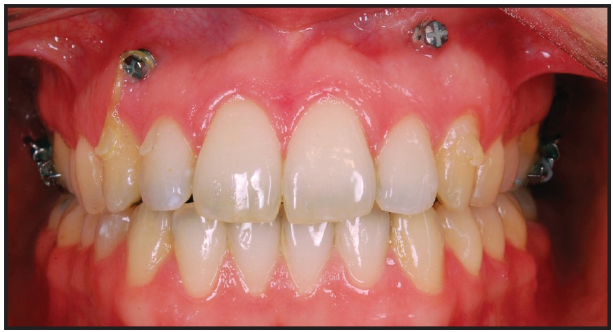 Anterior and posterior intrusion was required to reduce the gummy smile and make the upper and lower occlusal planes parallel, thus allowing more mandibular autorotation. Two Dual-Top JA standard mini-implants (1.4mm x 6mm) were inserted between the upper lateral incisors and canines (Fig. 6).
