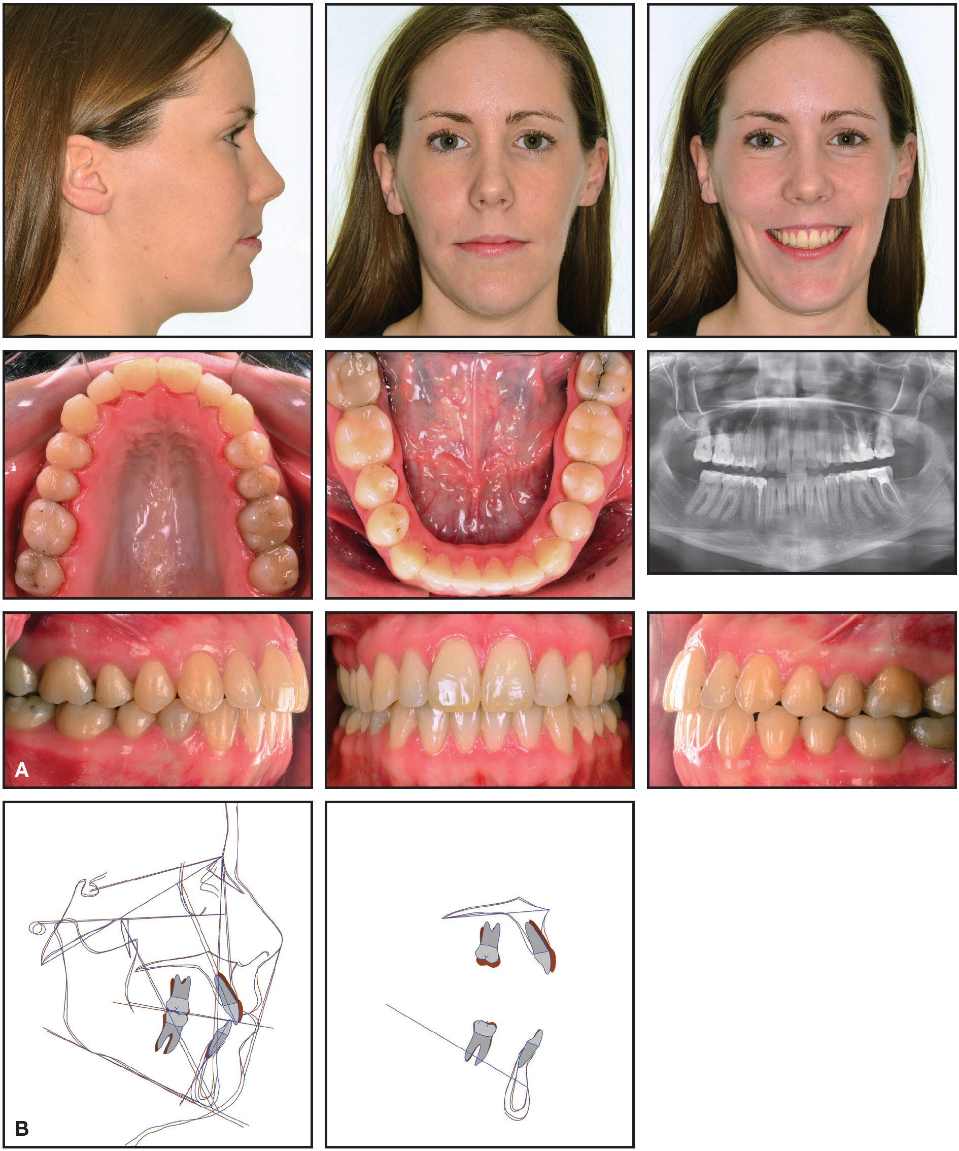 Orthodontic treatment was completed in 31 months, with the open bite closed and the incisor overlapping corrected. A canine and molar Class I relationship and normal function were achieved, with anterior and canine guidance (Fig. 8A). The treatment approach described here resolved the skeletal Class II pattern while intruding the posterior segments, allowing mandibular autorotation. Anterior intrusion during the second half of treatment improved the patient's facial appearance by achieving parallelism of the upper and lower occlusal planes and eliminating the gummy smile. Counterclockwise rotation of the mandible then reduced the lower facial height and increased the chin prominence, resulting in a more esthetic profile. Long-term stability was enhanced by the achievement of functional harmony among the orofacial muscles. The patient could close her lips without straining the mentalis muscle, and her open-mouth posture, which had caused mouth-breathing and a lower tongue placement, was alleviated.