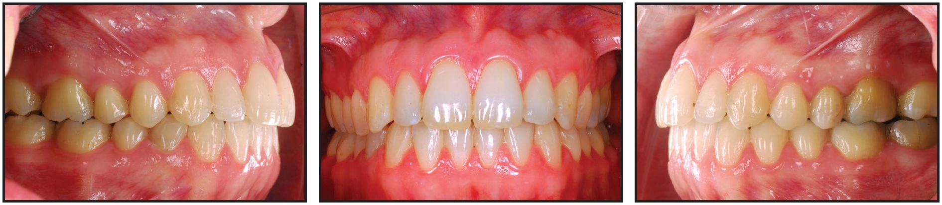 Six months later, this change in biomechanics had resulted in anterior extrusion, which inhibited autorotation of the mandible and exacerbated the gummy smile (Fig. 5). The maxillary cant became more noticeable because the gingiva was more visible on the right side than on the left.