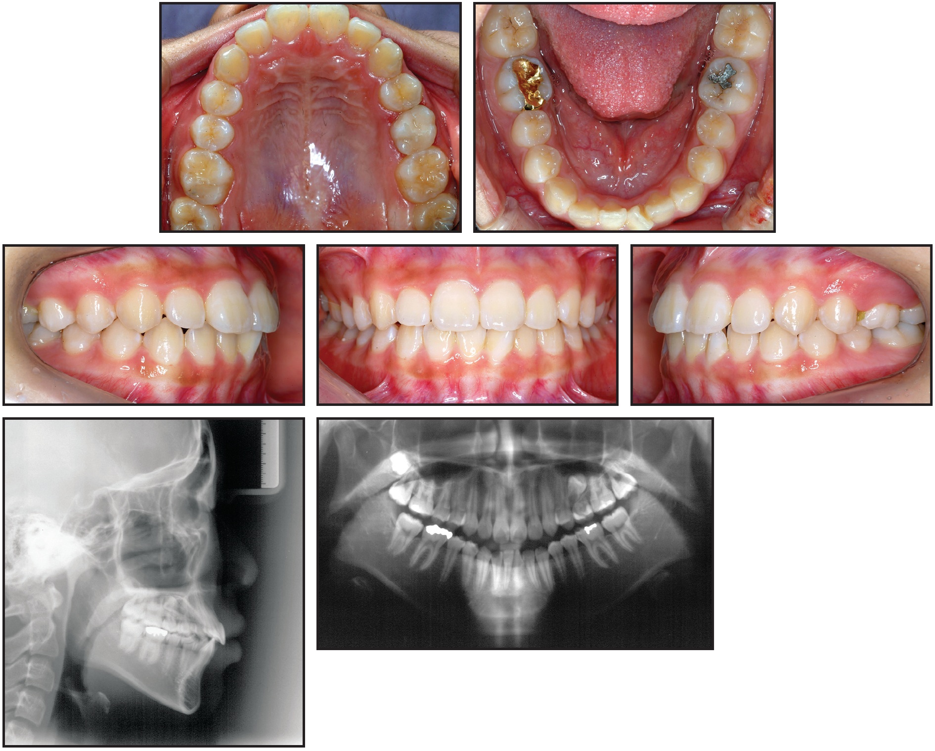 Fig. 1 14-year-old female patient with prolonged retention of second deciduous molar and bilateral Class I canine and molar relationships before treatment.