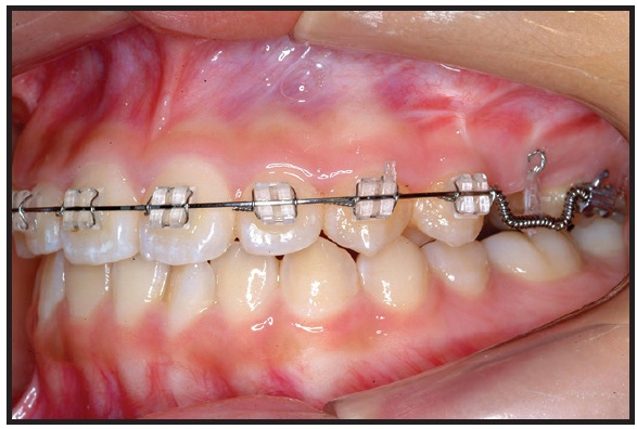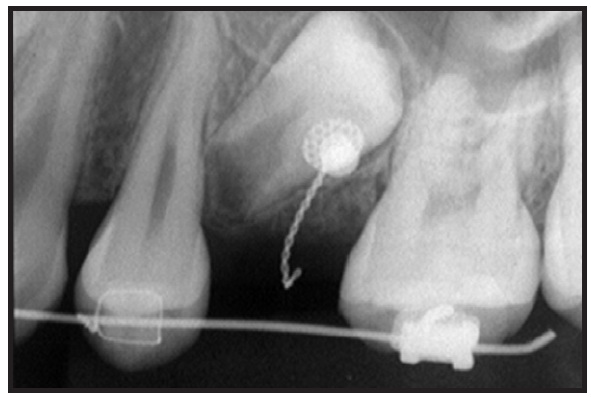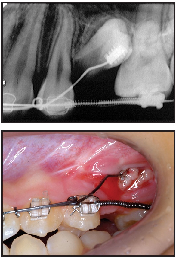An .018" × .022" MBT-prescription Inspire ICE* clear fixed appliance was bonded in the upper arch. After three months of initial leveling on .014", .016", and .016" × .022" G4** nickel titanium archwires, an .016" × .022" stainless steel archwire was inserted. The patient was then referred for extraction of the retained tooth and exposure of the impacted premolar by an oral surgeon. A metal lingual button was bonded to the impacted tooth, and a twisted stainless steel ligature wire was tied to the attachment (Fig. 2). The ligature wire was drawn inferiorly through the sutured edges of the flap, so that the surgical site could be completely closed.