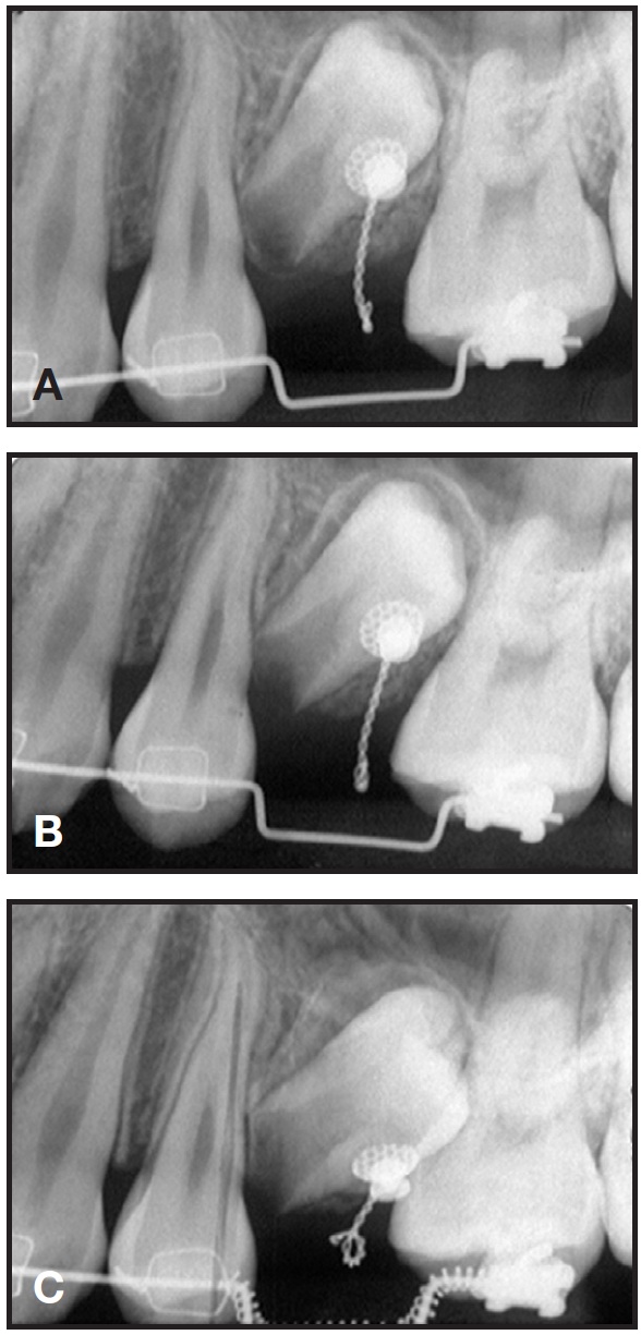 Traumatic injuries and obstructions to eruption are believed to be the most common causes of impacted anterior teeth; improper oral habits, such as nail biting or fingersucking, may also contribute.10 There was no history of facial or jaw trauma or TMD in our patient. We chose to use a closed-eruption technique because it usually provides the most esthetically pleasing result.11,12 Our patient’s premolar had a short root due to extensive tooth movement during root development. Therefore, the greatest challenge was to produce enough clockwise force to rotate the inverted tooth nearly 180° within the alveolar bone.