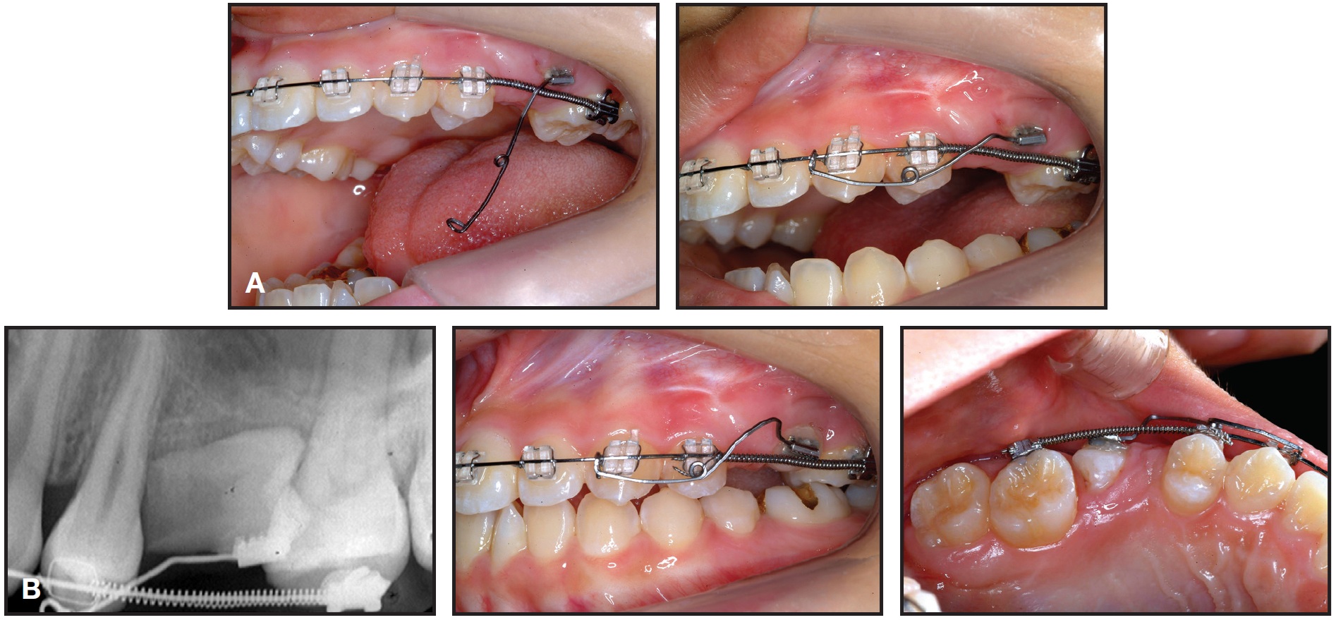 Fig. 6 A. Three months later, auxiliary wire activated to create additional rotational moment. B. After 11 months of treatment.