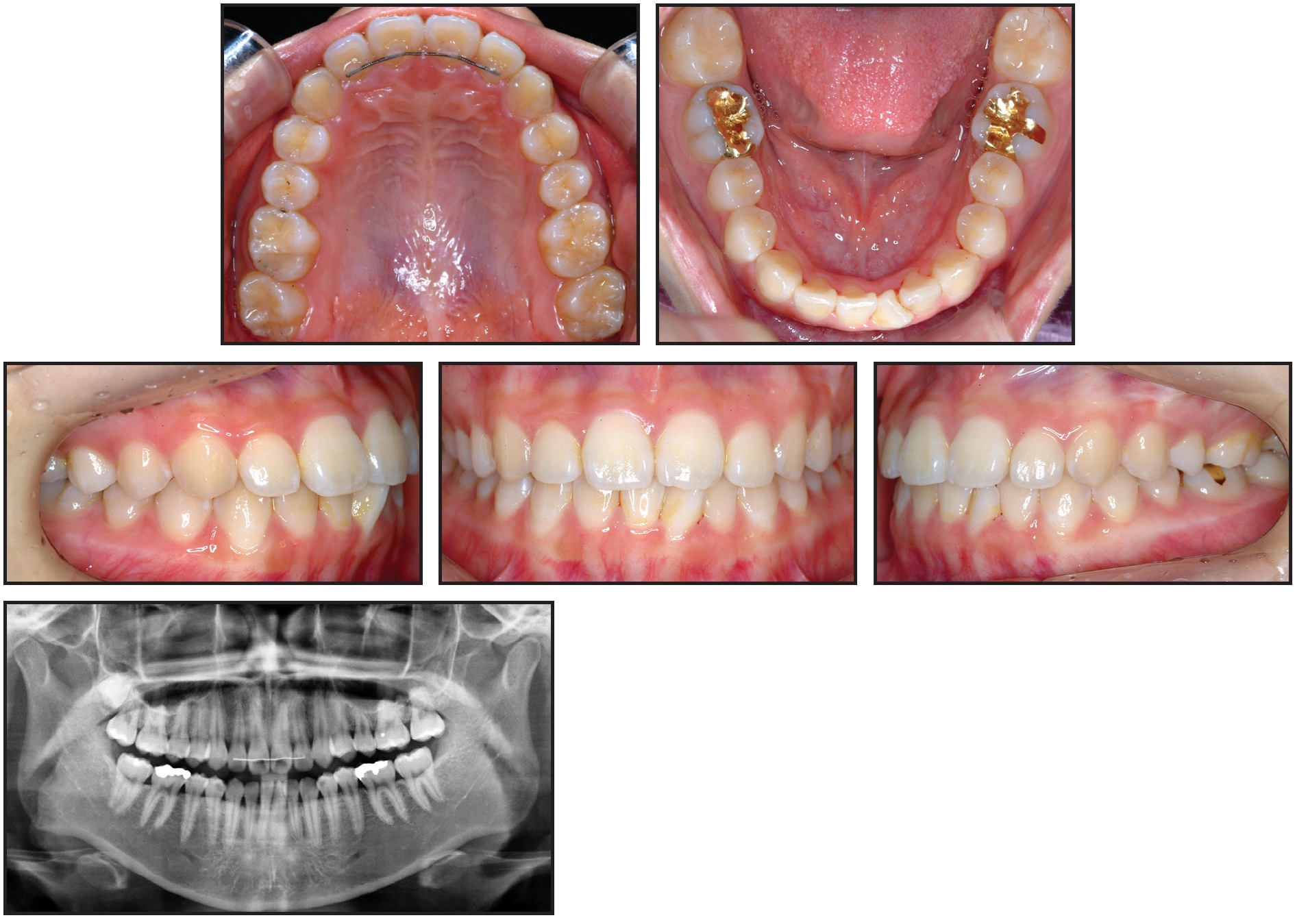 The treatment plan called for extraction of the retained deciduous teeth, space maintenance by fixed orthodontic treatment, and surgical exposure and traction of the impacted tooth into its proper position. Treatment was planned only for the upper dentition because of the patient’s concerns about cost.