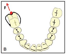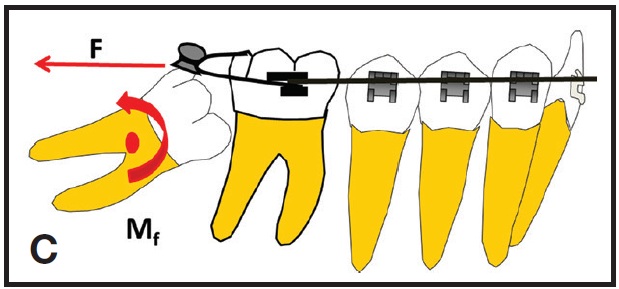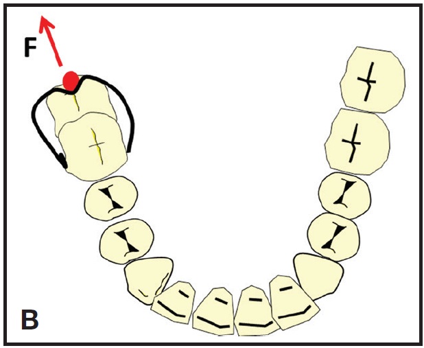 When the center of the U-loop is positioned under the button, a distal force is applied above the center of resistance of the second molar, generating a counterclockwise moment of the force (C). The U-loop can be further activated by repositioning the stops or rebonding the button more mesially.