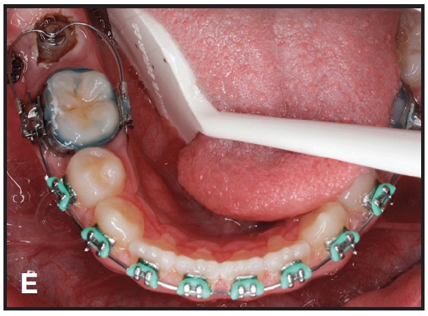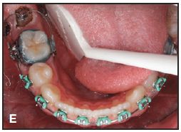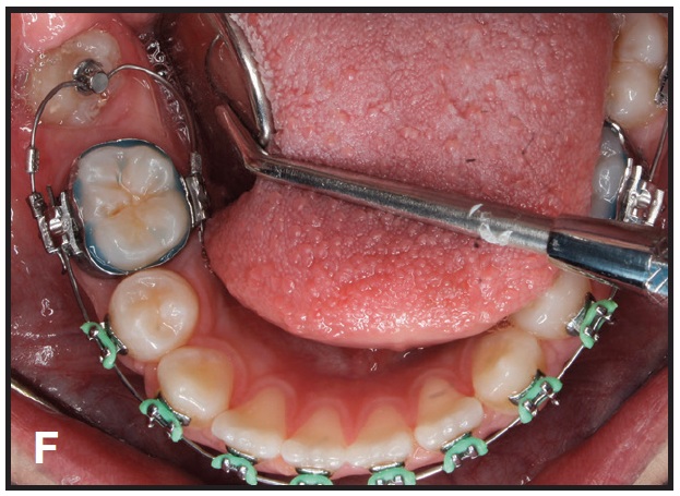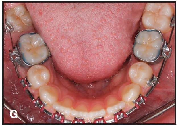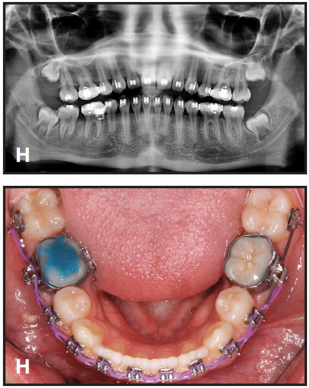 This technique is demonstrated in a 13-year-old female patient with an impacted lower right second molar (D). A U-loop spring was activated after surgical exposure of the tooth (E). Two months later, the second molar had been partially uprighted (F). After three more months of uprighting, the spring was removed and a continuous archwire was placed (G). It took another three months to completely upright the molar using straightwire mechanics, with no side effects on the anchor units (H).