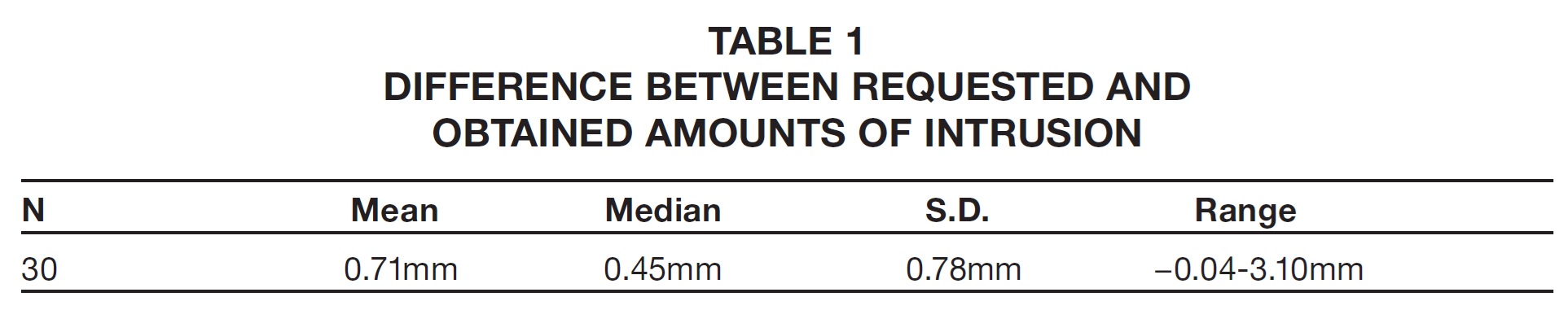 Our sizable standard deviation of .78mm indicates a wide variability in the differences between requested and obtained intrusion measurements. Of the 30 patients, nine showed a difference of .1mm or less, demonstrating nearly perfect tracking on a clinical level. Sixteen of the 30 had differences of less than .5mm, an amount that is likely to be of minimal clinical significance.
