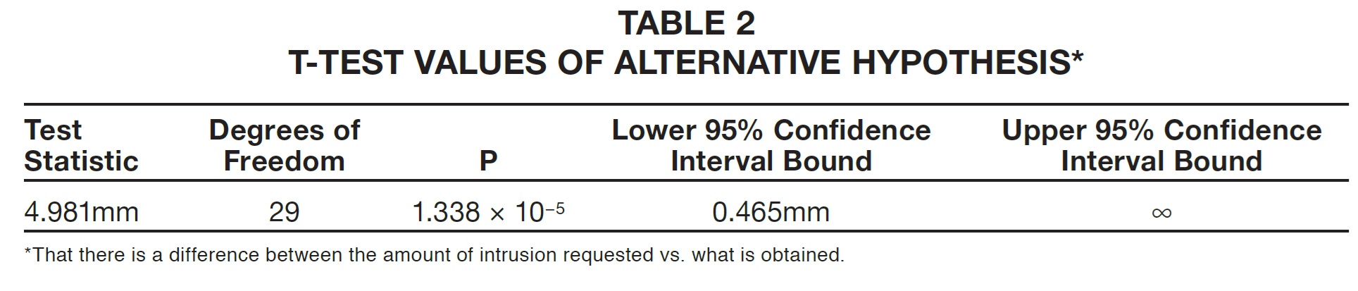 Based on this test, we could reject the null hypothesis that there is no difference between the amount of intrusion requested vs. what is obtained. The mean difference was clearly greater than 0mm. In fact, according to the confidence interval, we could be 95% confident that the indicated interval, starting at .465mm, contained the true mean difference.