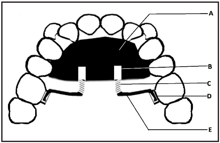 Fig. 1 Appliance design (A = acrylic covering over palatal surface; B = .036" Begg buccal tube embedded in acrylic; C = nickel titanium open-coil spring for force delivery; D = palatal molar sheath for attaching distal end of bayonet; E = bayonet made of .028" stainless steel wire).
