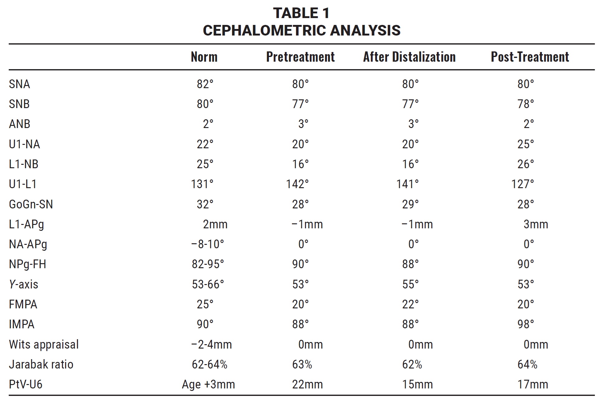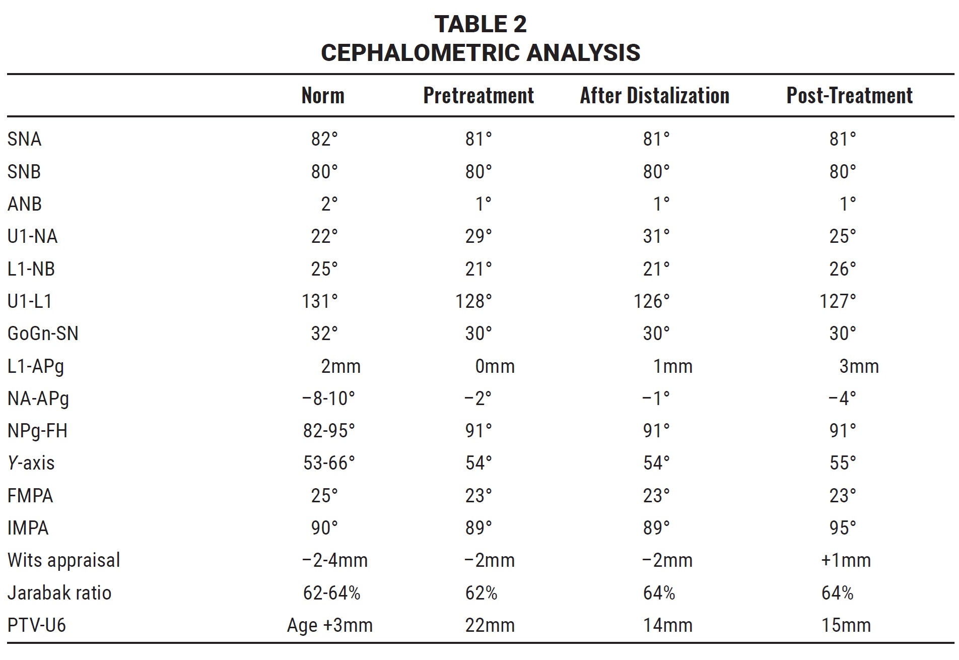 Cephalometric analysis showed a Class II molar relationship on a Class I skeletal base, owing to an orthognathic maxilla and an average mandibular growth pattern (Table 2).