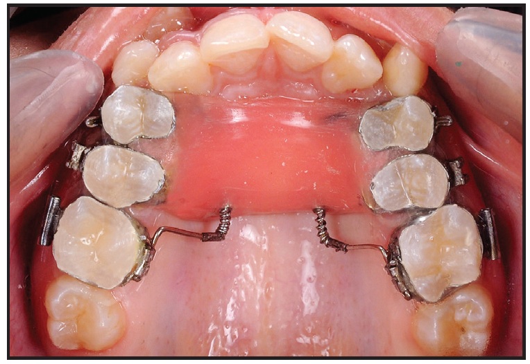 The first premolars and first molars are banded; banding of the second premolars is recommended for better anchorage. Palatal sheaths are welded to the upper first-molar bands (Fig. 1). The first and second premolars are attached with .040" wire to an acrylic covering that is in close contact with the palatal surface. If the overbite permits, this acrylic covering can be converted to an anterior biteplane to disclude the posterior teeth, thus enhancing molar distalization and deep-bite correction. Before polymerization, two .036" Begg buccal tubes are embedded in the acrylic near the distal margin, 5mm from the midline.