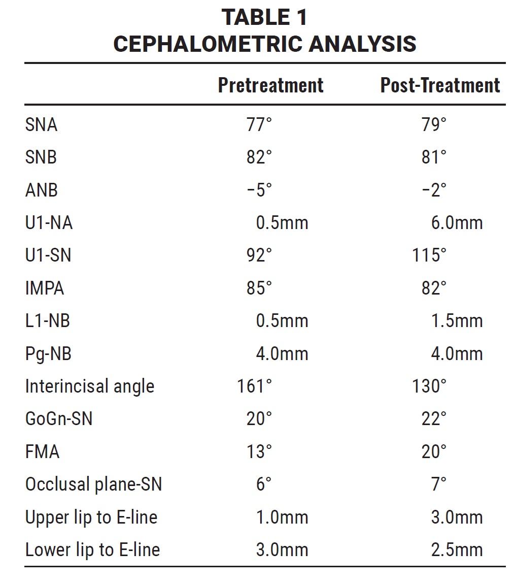 Failure to correct a pseudo-Class III at an early age may lead to the establishment of a skeletal Class III malocclusion.4,5 In our case, however, the maxillary incisor inclination was well within the established limit (120°) for dentoalveolar compensation in Class III treatment. Satisfactory occlusal and esthetic results were attributable to significant dentoalveolar compensation and excellent patient compliance.