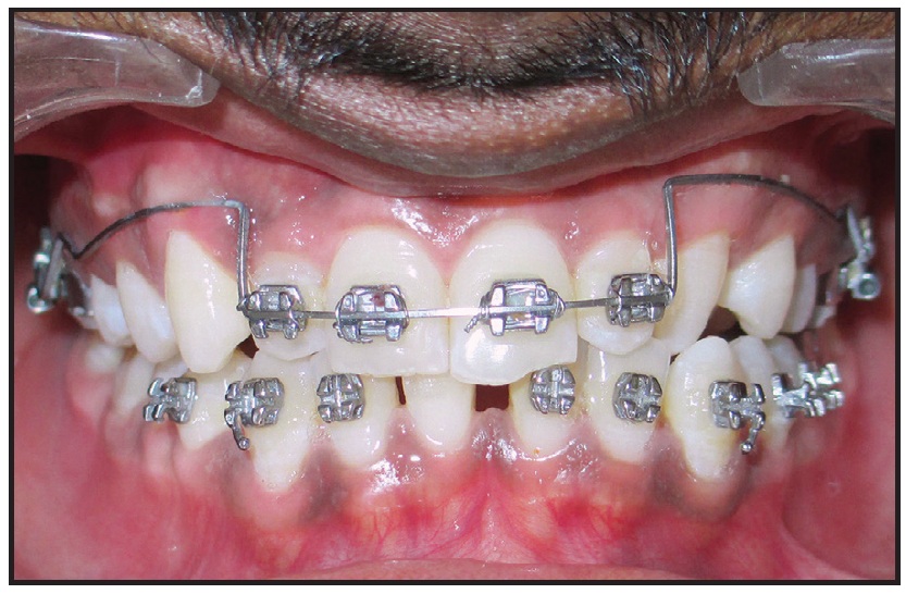 The posterior bite plate was trimmed occlusally at each monthly visit, and the patient was assessed for signs and symptoms of TMD. Positive overjet and overbite were achieved in nine months (Fig. 3). The upper canines and premolars were bonded, and reverse-curve .016" × .022" nickel titanium archwires were inserted for three months of leveling.