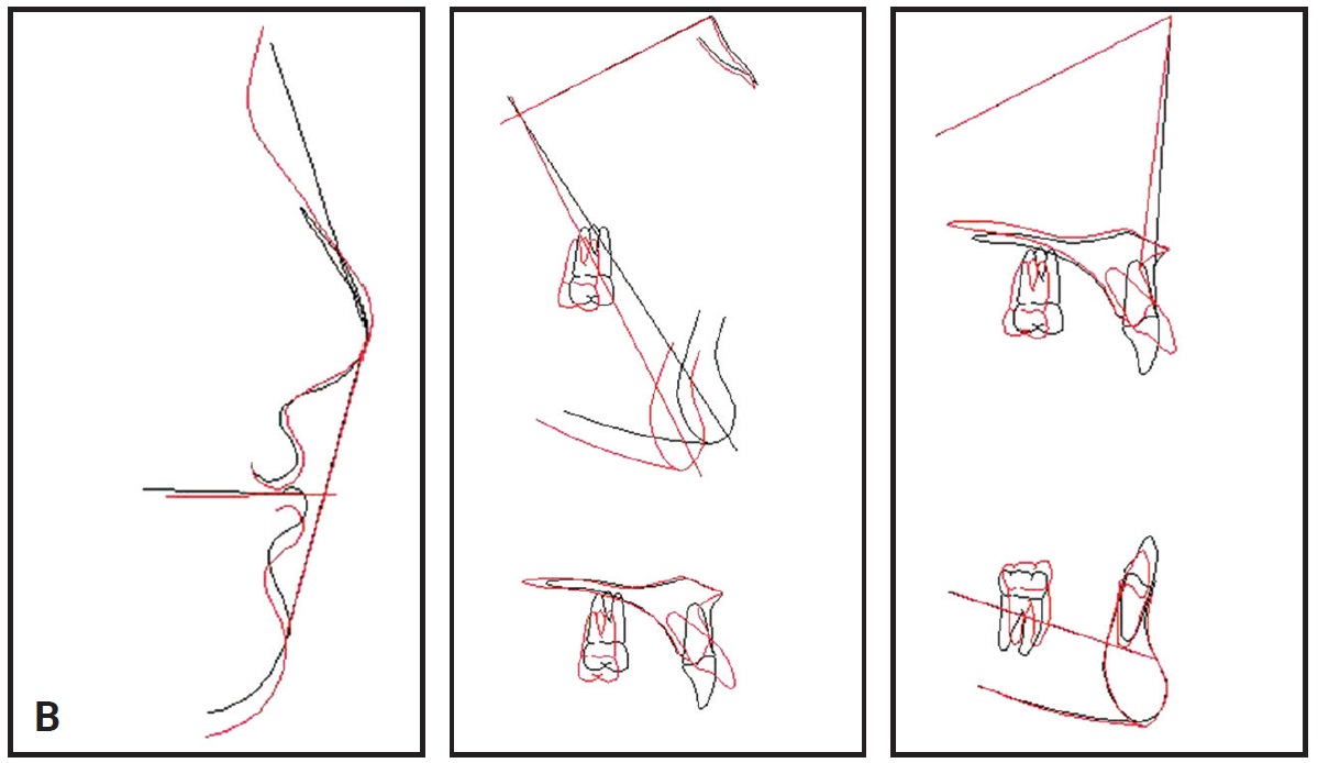 Maxillary and mandibular cephalometric superimpositions confirmed that the upper incisors were proclined labially and the lower posterior teeth were uprighted and moved distally (Fig. 5B, Table 1).