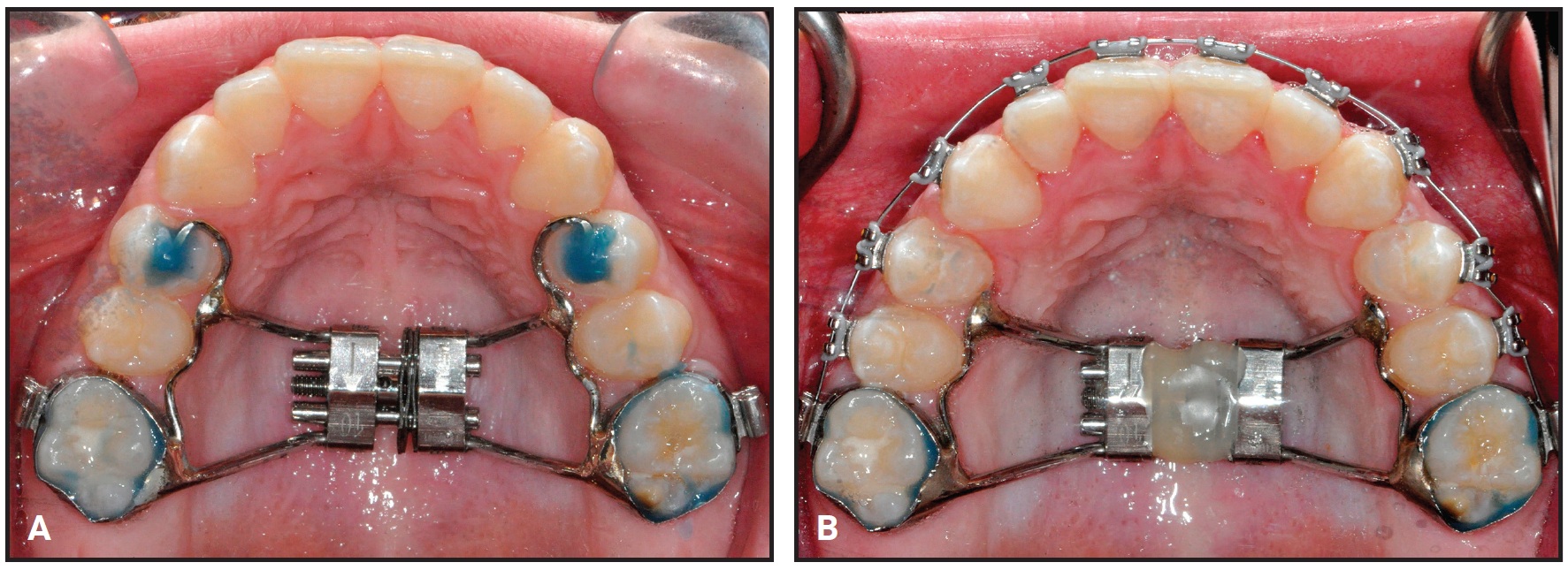 Fig. 2 Case 1. A. Memoria Leaf Spring Activated Expander*** cemented in place. B. After two and a half months of expansion, expansion screw stabilized with flowable composite.