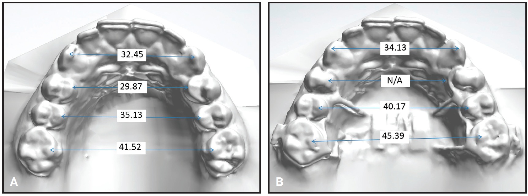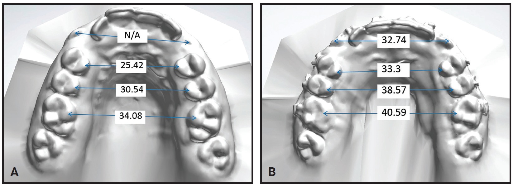 Fig. 8 Case 2. Maxillary dental arch-width measurements (mm) before (A) and after (B) expansion.