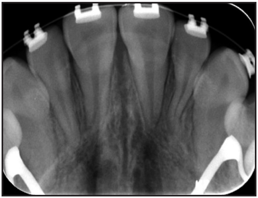 Fig. 10 Case 2. Occlusal radiograph showing no noticeable sutural disruption after expansion.