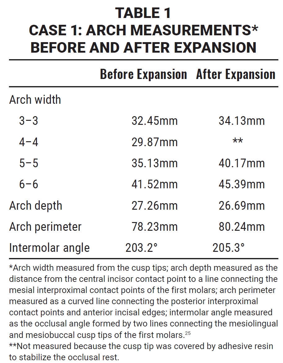Since the leaf springs come fully compressed from the lab, the preactivation should theoretically result in roughly 4mm of expansion as the springs decompress over time. The force expressed by the leaf springs diminishes after 2mm of decompression, however, so that in our experience, a clinician can assume that only half of this preactivation will be expressed. If 1mm of expansion can be obtained for every 10 activations of the expansion screw, as confirmed by the two cases shown here, another 2mm should be added to the total to account for preactivation of the appliance.