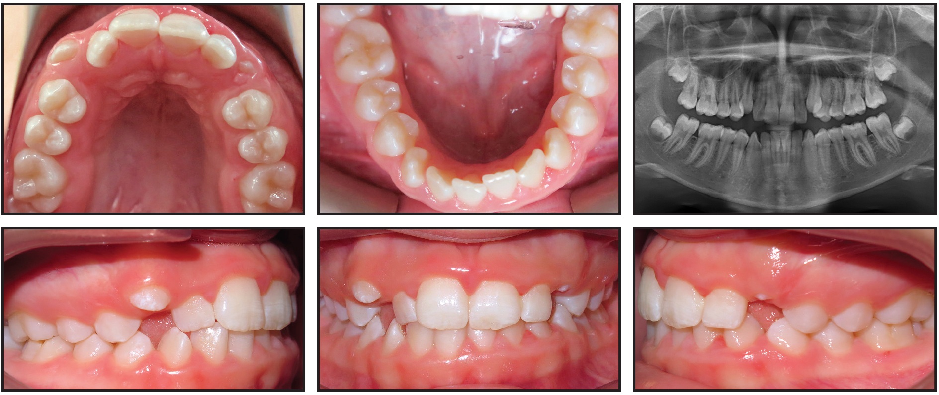 A 13-year-old female presented with the chief complaint of crowded teeth and a lower molar that was “growing in wrong.” She had a straight profile, with a prominent chin and an obtuse nasolabial angle, and she exhibited 90% incisal display on smiling and a normal lower anterior facial height. Further clinical examination showed a Class III subdivision right malocclusion, with MTD leading to constricted maxillary buccal segments (Fig. 1).