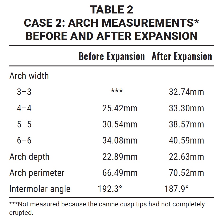 Lanteri and colleagues reported using the 6mm Memoria Leaf Spring Activated Expander in two mixed dentition cases, banding the maxillary primary molars and allowing spontaneous derotation and expansion of the maxillary first molars.23 Each patient received 10 activations per month. Active expansion typically lasted six months and was followed by a three-month passive retention phase. Archform, crossbite, midline deviation, and permanent molar rotation and expansion all improved and remained stable nine months after expansion. Average increases in arch width of 6.3mm, 5.9mm, 5.9mm, and 3.8mm were observed in the canine, first primary molar, second primary molar, and first permanent molar regions, respectively.