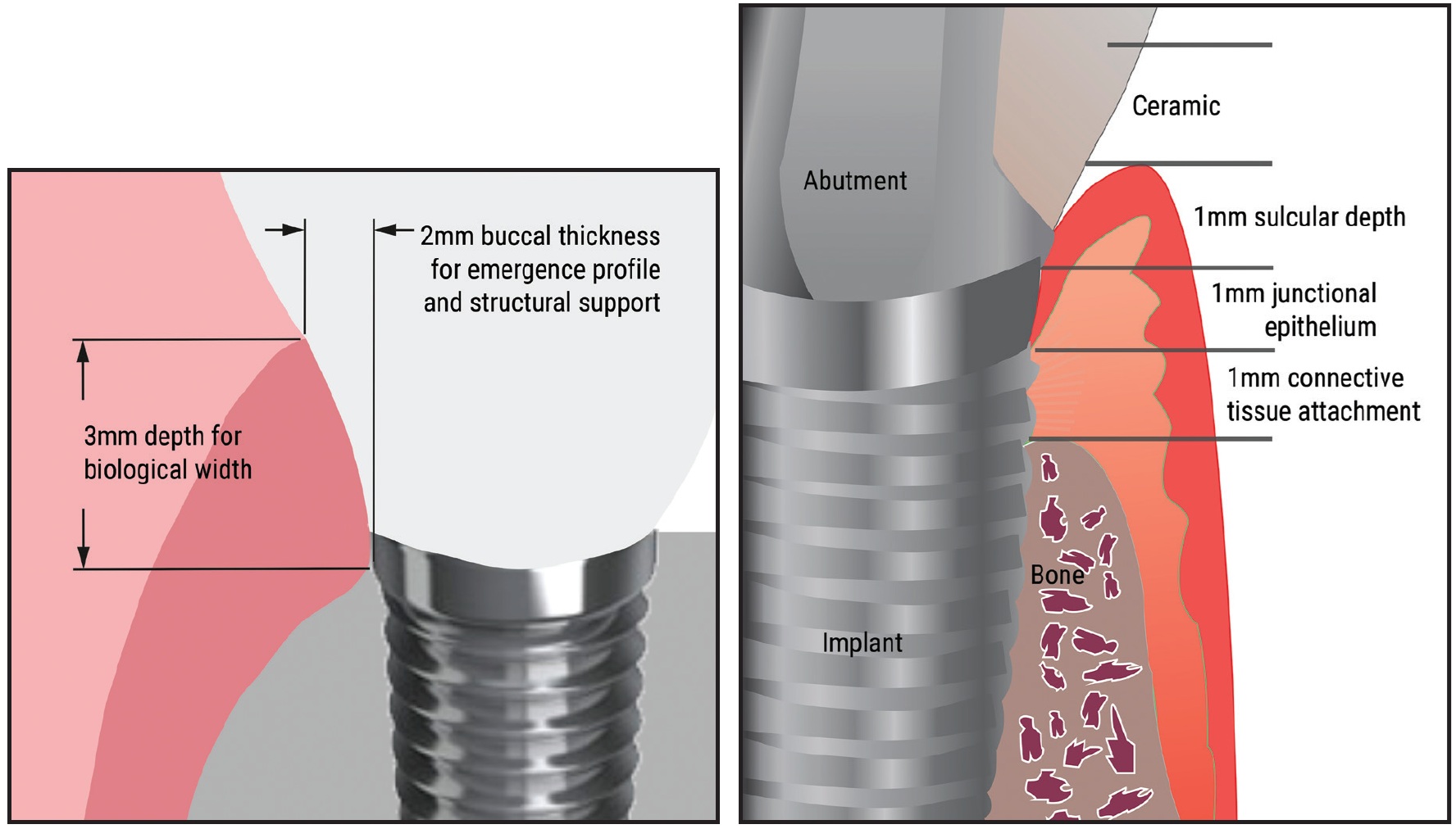Studies have shown that 2mm of buccal bone thickness is needed to provide a sufficient collateral blood supply from both the cortical bone and the adjacent connective tissue.17,28 In addition, the implant head must be placed 3mm deep, relative to the future labial crown margin, to allow the development of normal biological width and a physiological emergence profile for the ceramics, thus ensuring excellent esthetics.29,30