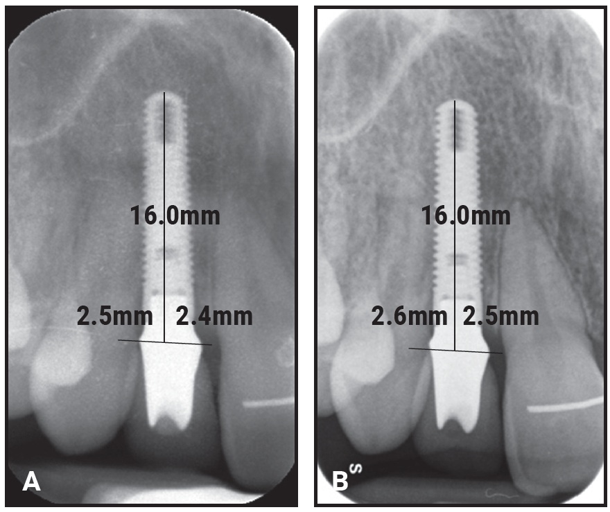Fig. 4 Example of periapical radiographs used to measure distances from crown-abutment junction to first visible mesial and distal bone-to-implant contacts at baseline (A) and follow-up (B).