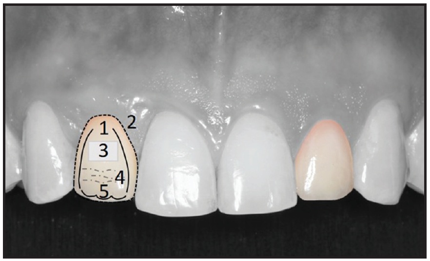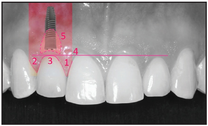 Fig. 6 Pink Esthetic Scores (1 = mesial papilla, 2 = distal papilla, 3 = soft-tissue contour, 4 = soft-tissue level, 5 = alveolar process).