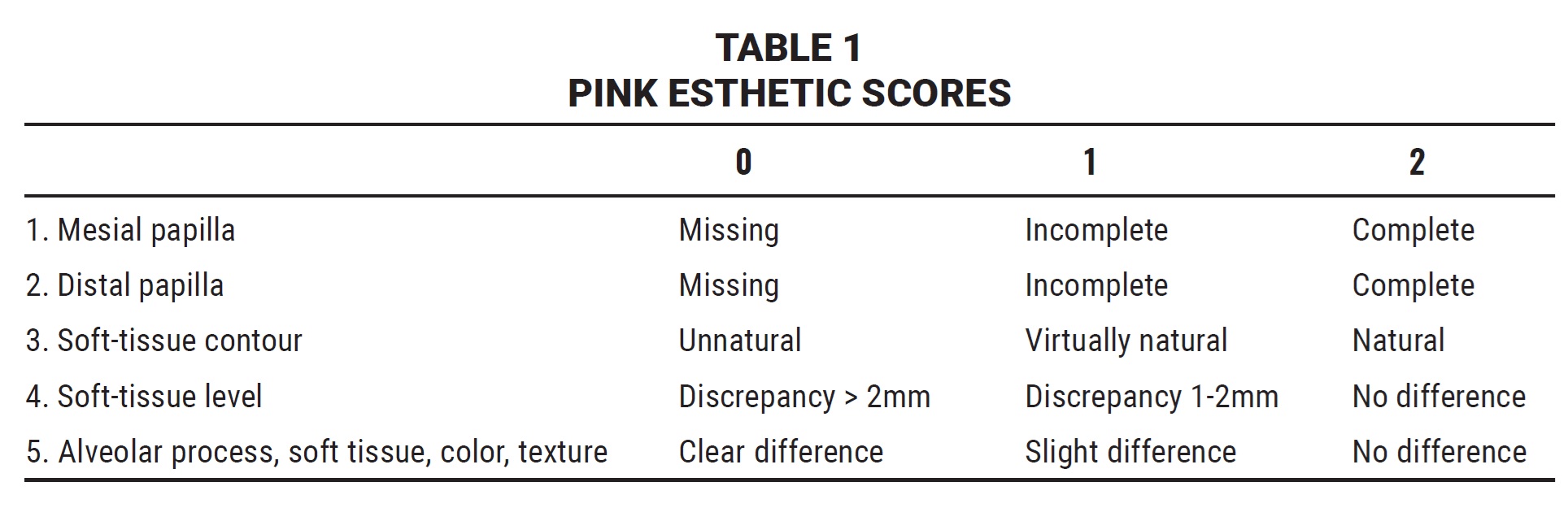- 47. Fürhauser, R.; Florescu, D.; Benesch, T.; Mailath, G.; and Watzek, G.: Evaluation of soft tissue around single-tooth implant crowns: The pink esthetic score, Clin. Oral Implants Res. 16:639-644, 2005.