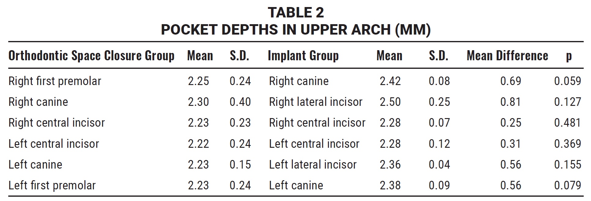 Only one patient in the IMP group exhibited a pocket depth of as much as 4mm on the mesial and distal aspects of the implant. All other evaluated sites in both groups had pocket depths between 2-3mm, with overall means of 2.24mm in the OSC group and 2.37mm in the IMP group (Table 2). No statistical difference was observed between the two groups or between the similarly positioned teeth.
