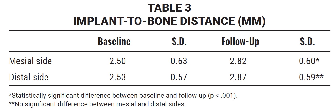 No statistically significant difference in clinical periodontal condition could be observed between the two patient groups. Comparison of the IMP periapical radiographs at T1 and T2 revealed only minor changes between the marginal bone levels at baseline (crown delivery) and follow-up. The mean differences in implant-to-bone distance from T1 to T2 were .32mm on the mesial and .34mm on the distal sides of the implants (Table 3). Differences between baseline and follow-up were statistically significant (p < .001), but there was no significant difference between the mesial and distal sides of the implants (p = .868).