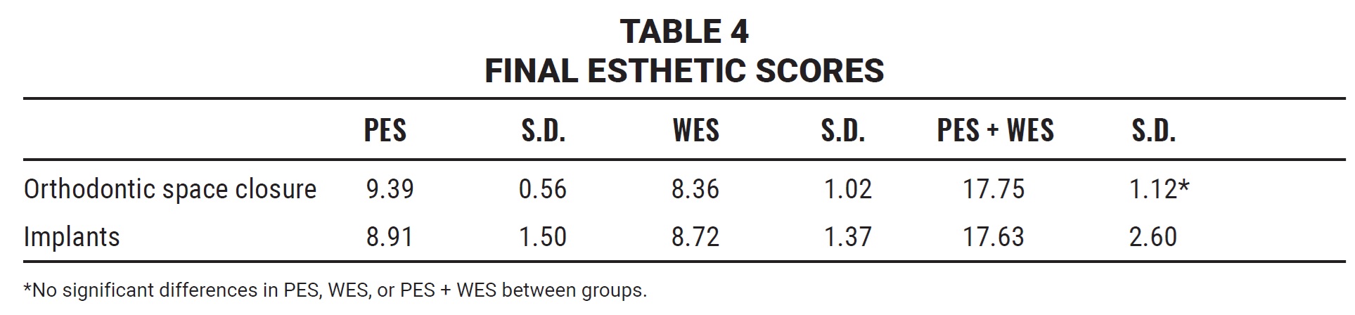 Our mean PES + WES for the IMP group (17.63) was higher than that found in other studies. Kolerman and colleagues reported a mean PES + WES of 14.44 for immediately restored implants.61 Similarly, three years after immediate post-extraction placement of single-tooth implants in the esthetic zone, Cosyn and colleagues found a PES + WES of 20 in 21% of the patients, between 14 and 20 in 58%, and less than 14 in 21%.62 After two to four years of loading, Buser and colleagues noted a PES + WES of 14.757; after six years in function, Eccellente and colleagues reported a PES + WES of 14.4.30 These studies evaluated only immediate and early post-extraction implants, however, in locations where hard-tissue peri-implant conditions may be less ideal than in orthodontically prepared alveolar ridges.