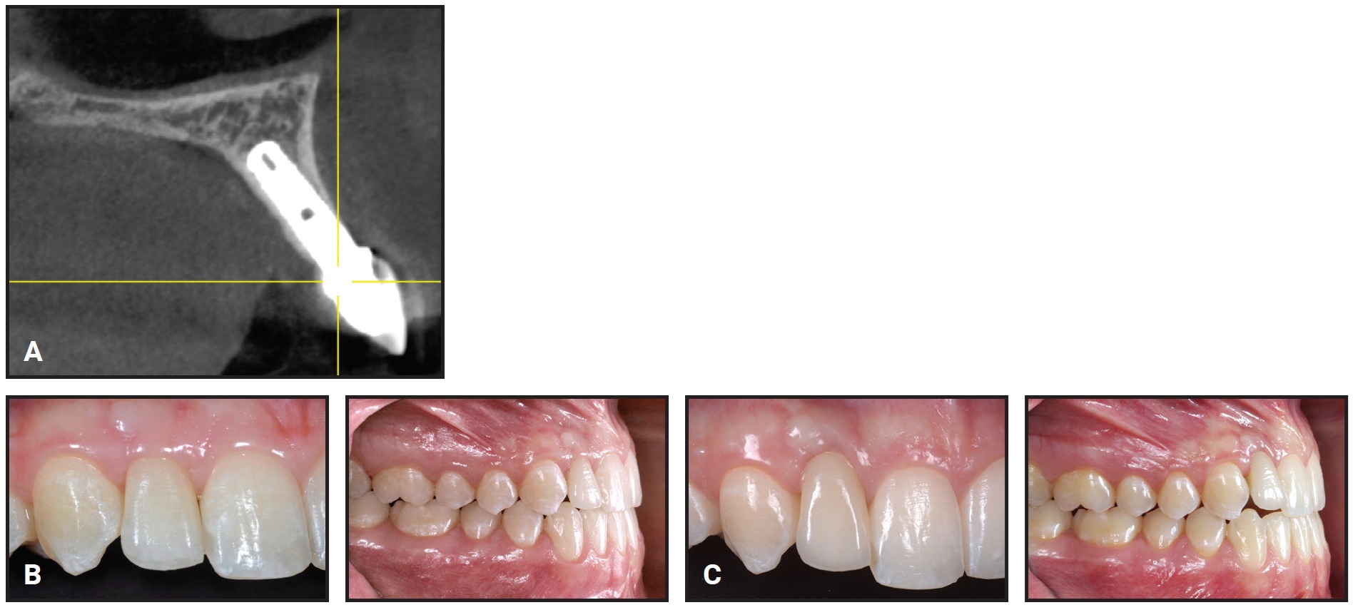 Fig. 9 Only patient to develop infraocclusion had submerged implant placed with graft (deproteinized bovine bone mineral particles) during orthodontic treatment. A. Minimal facial bony wall over implant. B. At final crown delivery. C. At follow-up, showing minor orthodontic relapse.