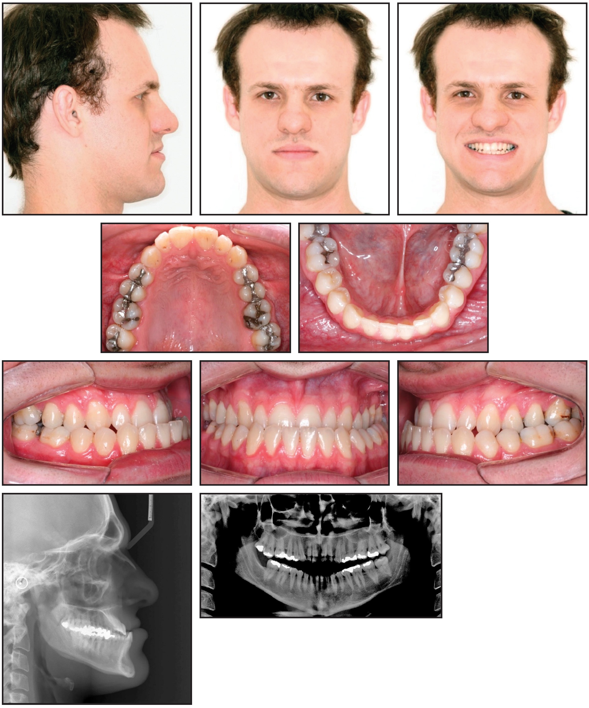 A bilateral Class I molar and canine relationship with coincident midlines, positive overjet, and solid intercuspation was achieved. Mild improvements were seen in the facial profile and smile esthetics.