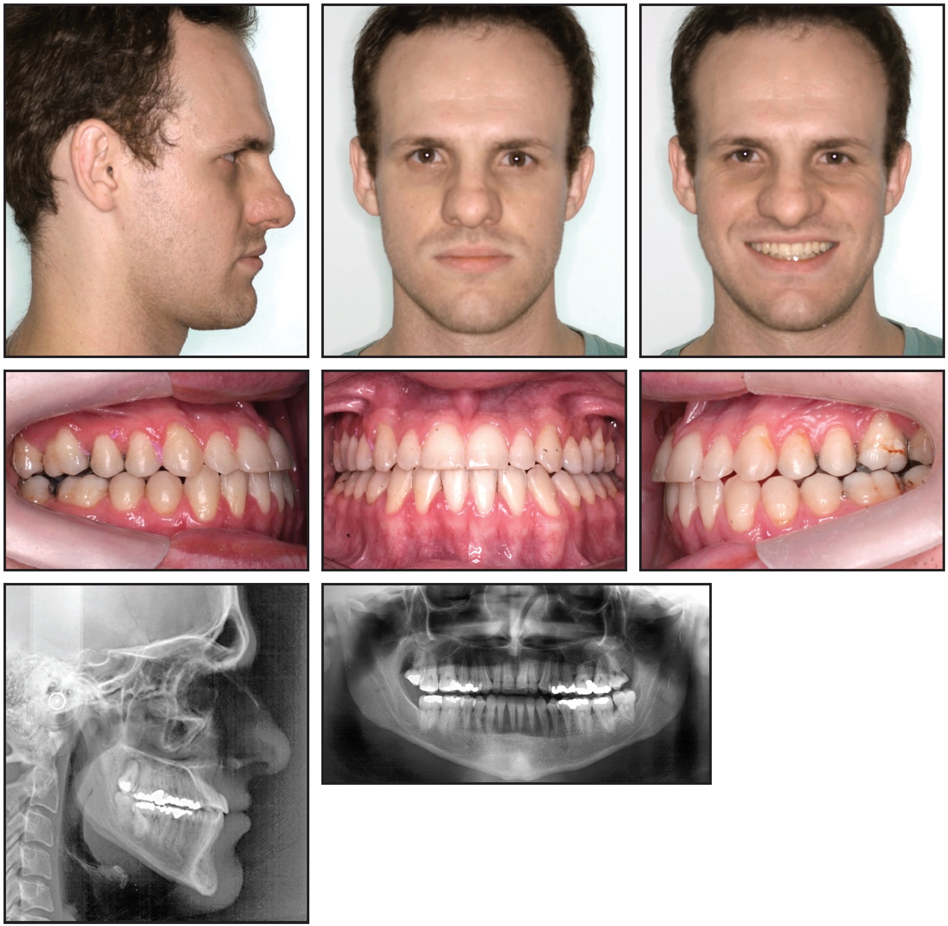 A 25-year-old male presented with the chief complaint of an anterior crossbite. Clinical evaluation showed a slightly concave profile, protrusive lower and retrusive upper lips, a passive labial seal with mild hypotonia of the upper lip, and a deficient nasolabial angle (Fig. 1).