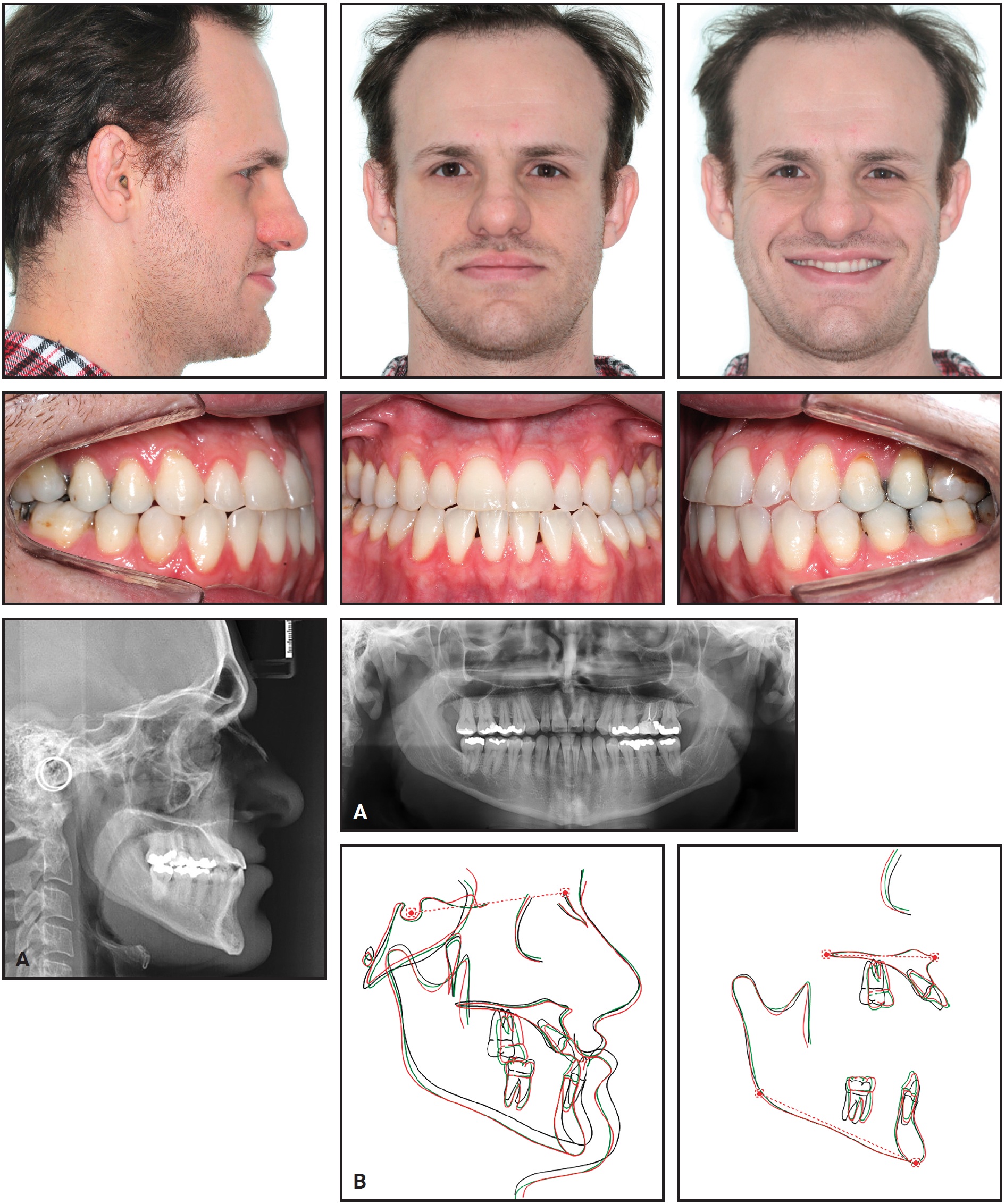 Fig. 3 A. Patient five years after treatment. B. Superimposition of pretreatment (black), post-treatment (green), and five-year follow-up (red) cephalometric tracings.