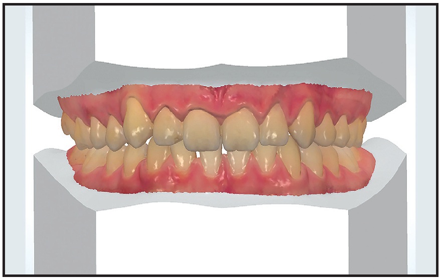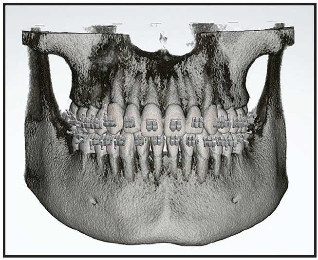 Intraoral scanning of both arches and the bite was completed with a TRIOS* color intraoral scanner, according to the manufacturer’s instructions. After scanning, the models were imported into OrthoAnalyzer** software. Volumetric data from the patient’s cone-beam computed tomography (CBCT) were loaded to the software, and the CBCT and intraoral scan were aligned.